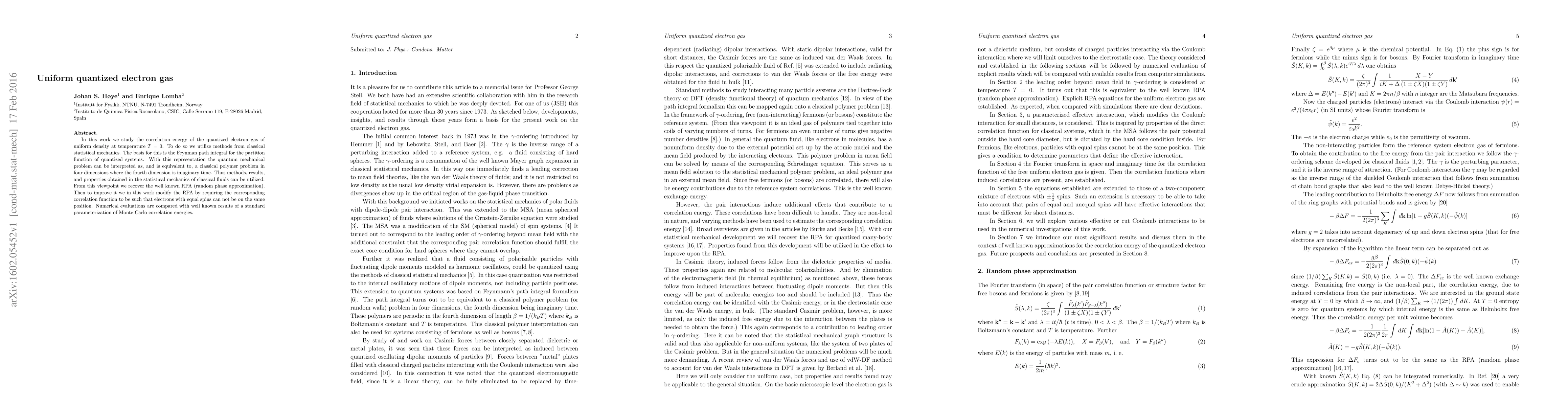 In this work we study the correlation energy of the quantized electron gas of uniform density at temperature $T=0$. To do so we utilize methods from classical statistical mechanics. The basis for this is the Feynman path integral for the partition function of quantized systems. With this representation the quantum mechanical problem can be interpreted as, and is equivalent to, a classical polymer problem in four dimensions where the fourth dimension is imaginary time. Thus methods, results, and properties obtained in the statistical mechanics of classical fluids can be utilized. From this viewpoint we recover the well known RPA (random phase approximation). Then to improve it we in this work modify the RPA by requiring the corresponding correlation function to be such that electrons with equal spins can not be on the same position. Numerical evaluations are compared with well known results of a standard parameterization of Monte Carlo correlation energies.