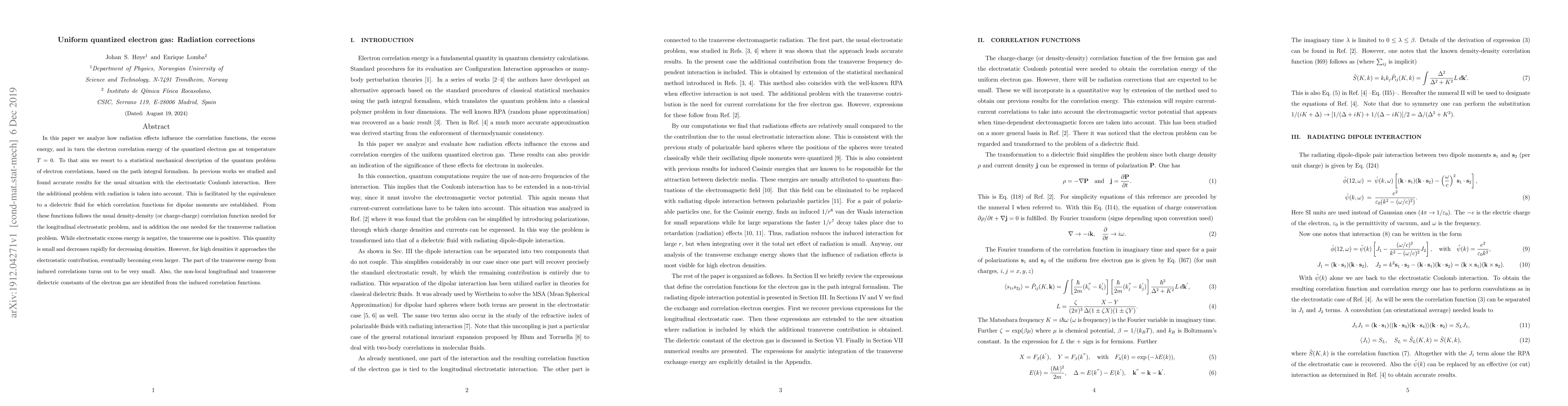 The paper presents a detailed statistical mechanical analysis of radiation corrections in a quantized electron gas, identifying both longitudinal and transverse correlation functions and dielectric constants.