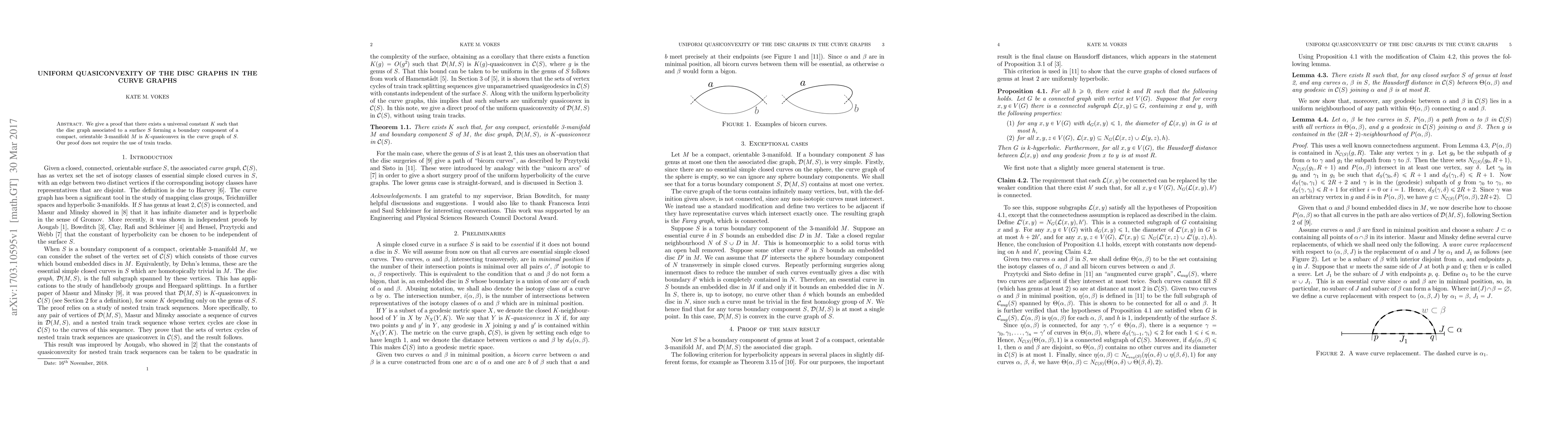 We give a proof that there exists a universal constant $K$ such that the disc graph associated to a surface $S$ forming a boundary component of a compact, orientable 3-manifold $M$ is $K$-quasiconvex in the curve graph of $S$. Our proof does not require the use of train tracks.