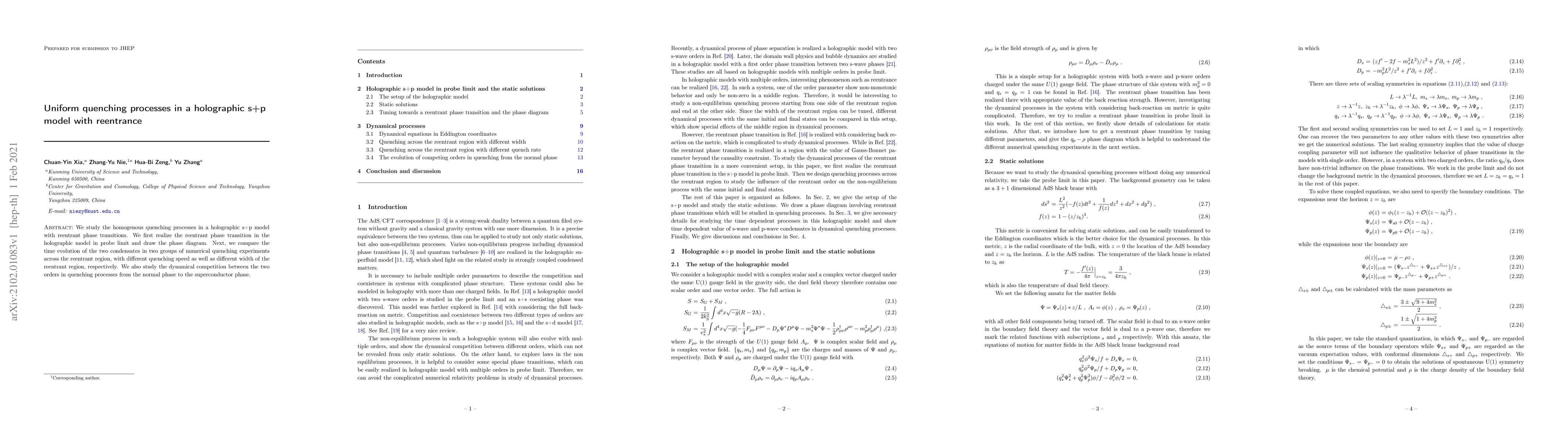This paper investigates uniform quenching processes in a holographic s+p model featuring reentrant phase transitions, mapping out the phase diagram and analyzing the time evolution of two condensates under various quenching speeds and reentrant region widths. It also examines the dynamic competition between the two orders during transitions from the normal to the superconducting phase.