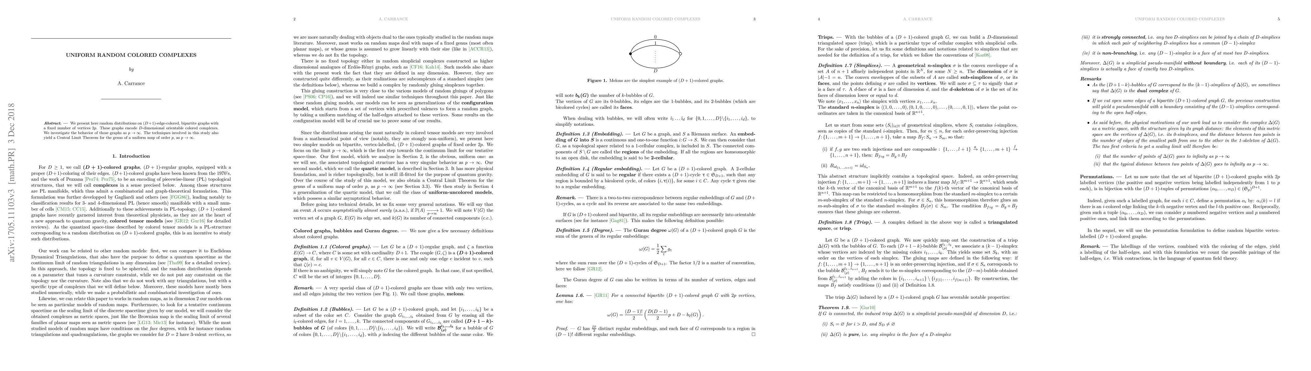 This paper examines random distributions on $(D+1)$-edge-colored bipartite graphs with $2p$ vertices, dual to $D$-dimensional colored complexes, and investigates their properties as $p$ approaches infinity, including a Central Limit Theorem for the genus of uniform maps.