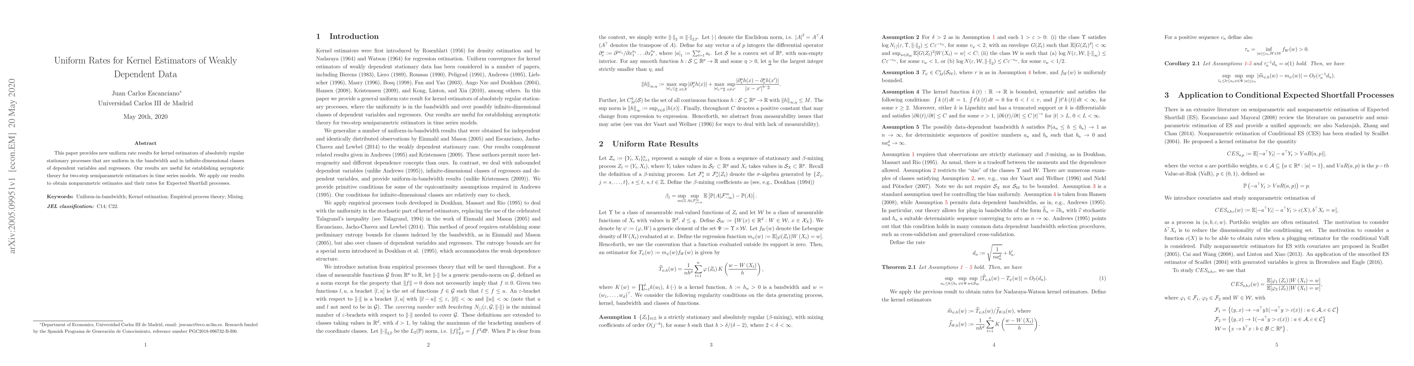 This paper establishes uniform rate results for kernel estimators of weakly dependent stationary processes, applicable across various bandwidths and infinite-dimensional classes. It provides foundational asymptotic theory for two-step semiparametric estimators in time series models and demonstrates its application in estimating Expected Shortfall processes.