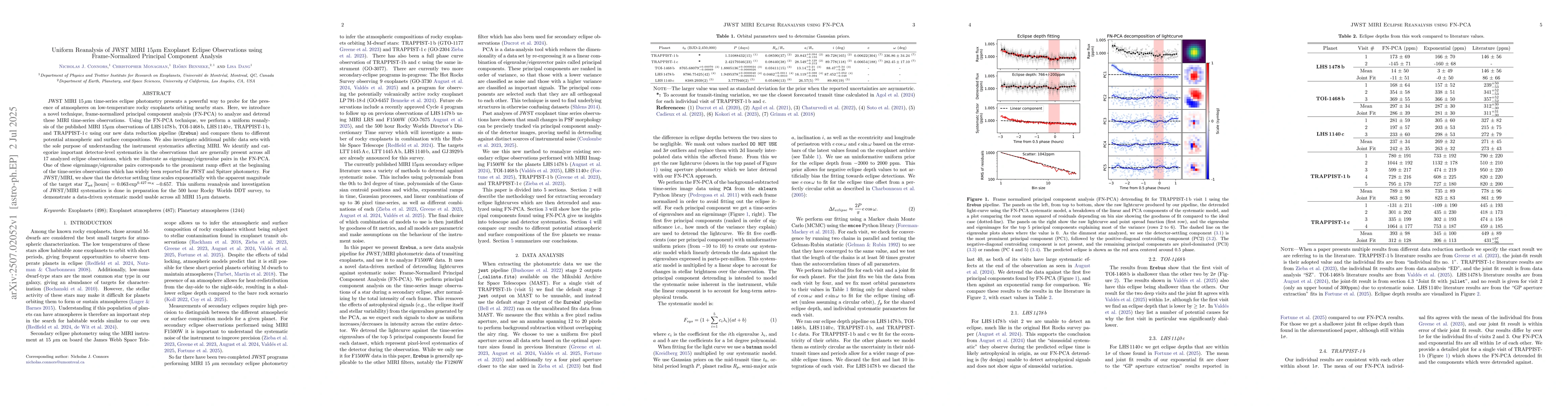 JWST MIRI 15 micron time-series eclipse photometry presents a powerful way to probe for the presence of atmospheres on low-temperature rocky exoplanets orbiting nearby stars. Here, we introduce a novel technique, frame-normalized principal component analysis (FN-PCA) to analyze and detrend these MIRI time-series observations. Using the FN-PCA technique, we perform a uniform reanalysis of the published MIRI 15 micron observations of LHS 1478 b, TOI-1468 b, LHS 1140 c, TRAPPIST-1 b, and TRAPPIST-1 c using our new data reduction pipeline (Erebus) and compare them to different potential atmospheric and surface compositions. We also investigate additional public data sets with the sole purpose of understanding the instrument systematics affecting MIRI. We identify and categorize important detector-level systematics in the observations that are generally present across all 17 analyzed eclipse observations, which we illustrate as eigenimage/eigenvalue pairs in the FN-PCA. One of these eigenimage/eigenvalue pairs corresponds to the prominent ramp effect at the beginning of the time-series observations which has widely been reported for JWST and Spitzer photometry. For JWST/MIRI, we show that the detector settling time scales exponentially with the apparent magnitude of the target star $T_\mathrm{set} \mathrm{[hours]} = 0.063\exp^{0.427\cdot m_K} -0.657$. This uniform reanalysis and investigation of JWST/MIRI systematics is done in preparation for the 500 hour Rocky Worlds DDT survey, to demonstrate a data-driven systematic model usable across all MIRI 15 micron datasets.