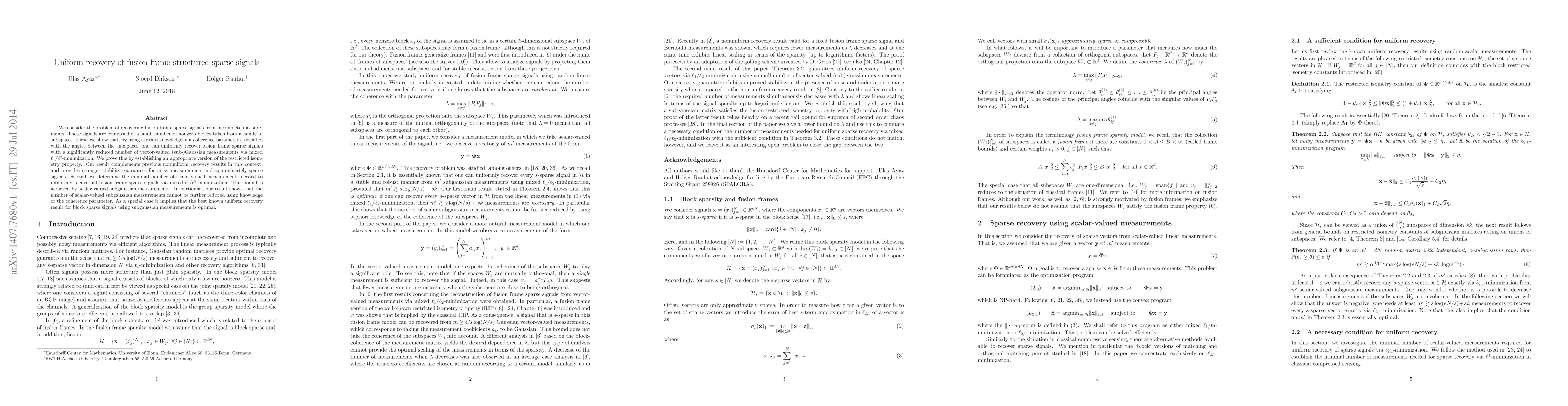 The paper demonstrates a method for uniformly recovering fusion frame sparse signals using fewer vector-valued Gaussian measurements, leveraging coherence parameter knowledge and mixed l^1/l^2-minimization. It also establishes the minimal number of scalar-valued subgaussian measurements needed for uniform recovery, showing this number is optimal.
