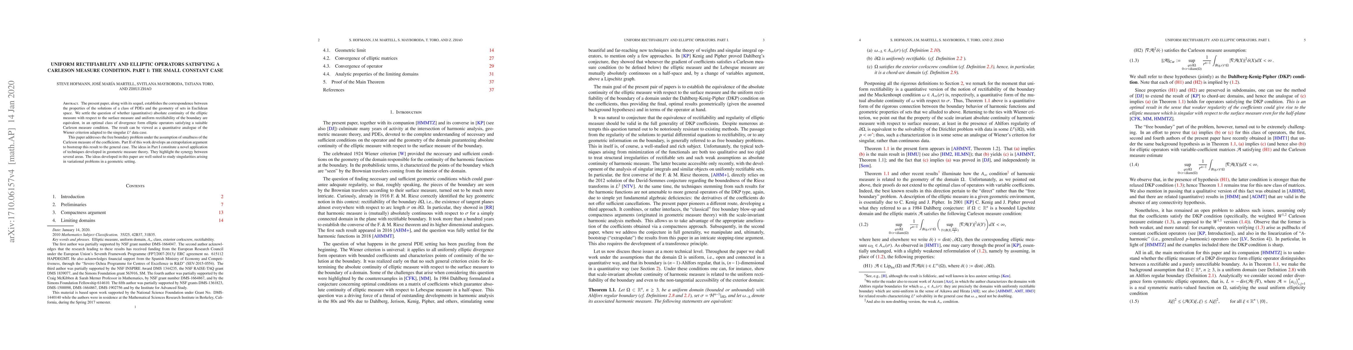 The present paper, along with its sequel, establishes the correspondence between the properties of the solutions of a class of PDEs and the geometry of sets in Euclidean space. We settle the question of whether (quantitative) absolute continuity of the elliptic measure with respect to the surface measure and uniform rectifiability of the boundary are equivalent, in an optimal class of divergence form elliptic operators satisfying a suitable Carleson measure condition. The result can be viewed as a quantitative analogue of the Wiener criterion adapted to the singular $L^p$ data case. This paper addresses the free boundary problem under the assumption of smallness of the Carleson measure of the coefficients. Part II of this work develops an extrapolation argument to bootstrap this result to the general case. The ideas in Part I constitute a novel application of techniques developed in geometric measure theory. They highlight the synergy between several areas. The ideas developed in this paper are well suited to study singularities arising in variational problems in a geometric setting.