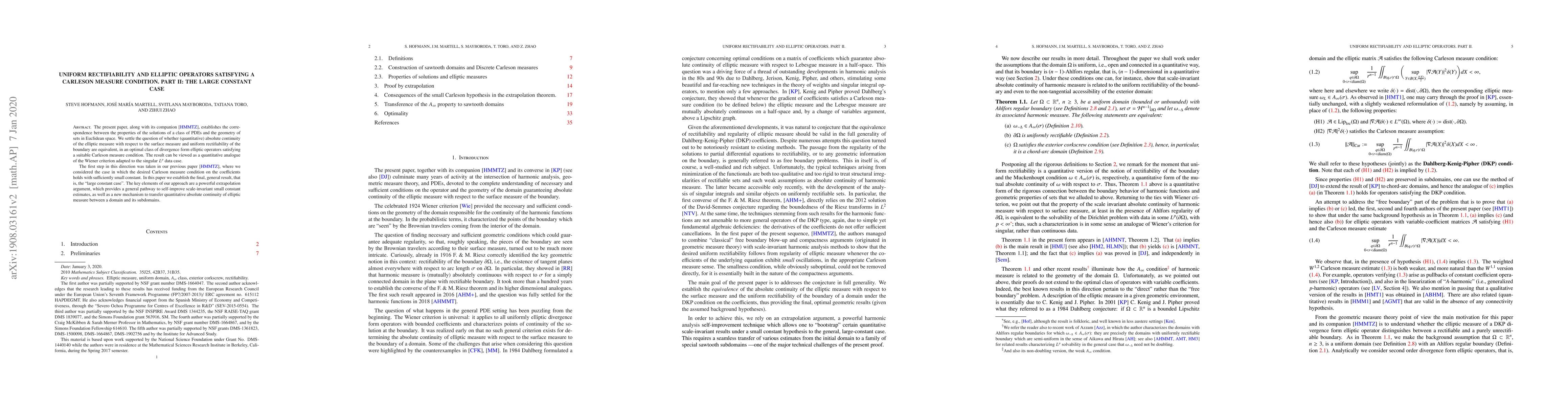 This paper, part of a series, investigates the relationship between uniform rectifiability of boundaries and elliptic operators' properties under a Carleson measure condition, confirming their equivalence in the large constant case. It builds on previous work and employs an extrapolation argument and a new quantitative continuity mechanism to achieve this result.