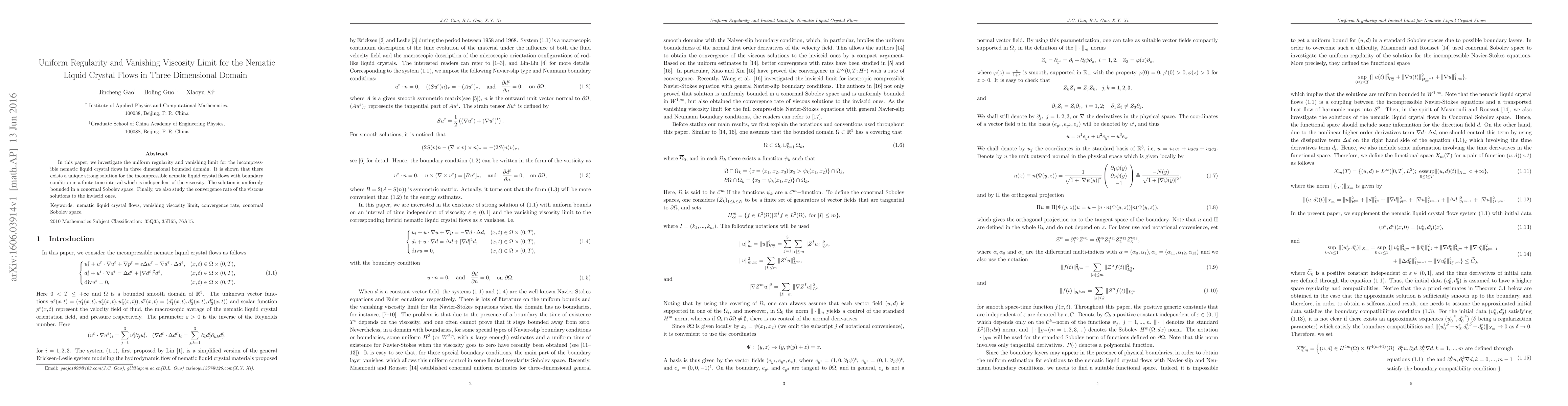 This paper examines uniform regularity and vanishing viscosity limits for incompressible nematic liquid crystal flows in three-dimensional domains. It demonstrates the existence of a unique strong solution that remains uniformly bounded and converges to an inviscid solution as viscosity approaches zero.