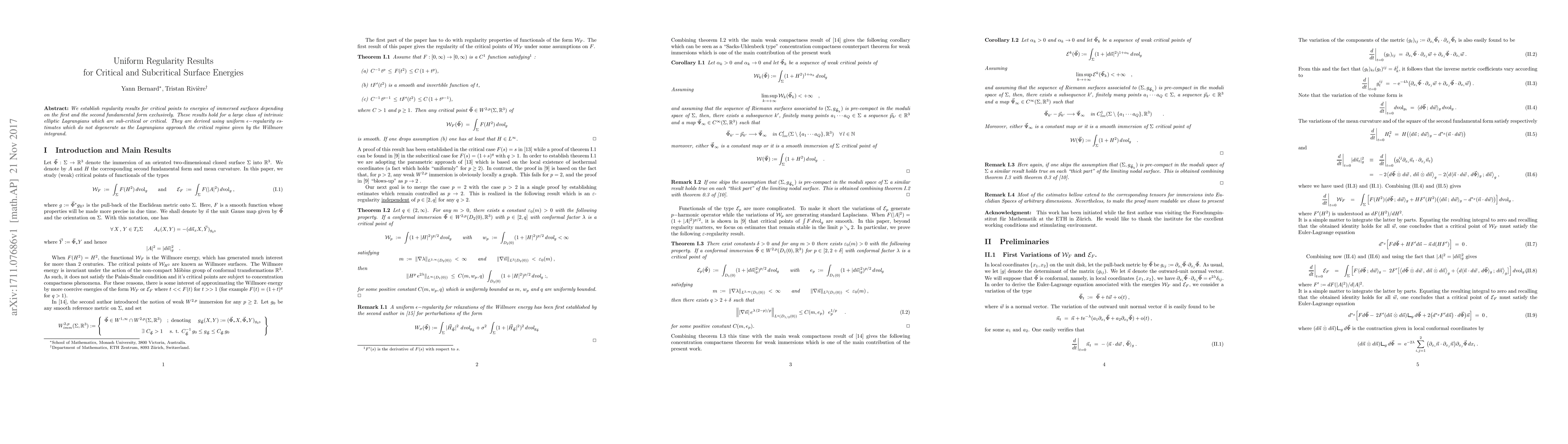 The paper establishes regularity results for critical points of surface energies using only the first and second fundamental forms, applicable to a wide range of intrinsic elliptic Lagrangians.