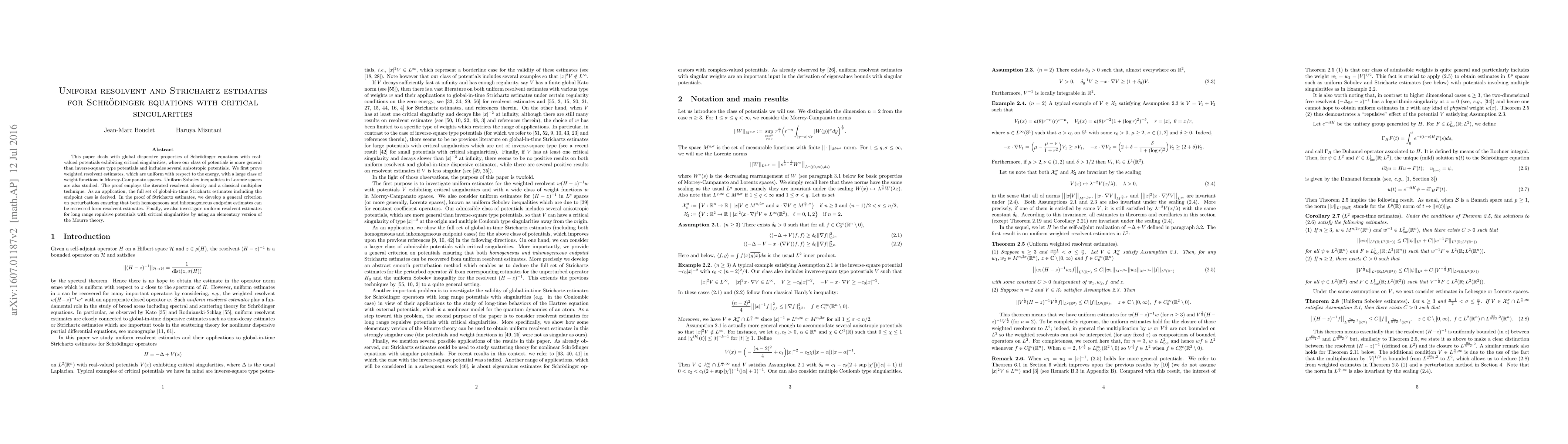 This paper establishes global dispersive properties for Schrödinger equations with critical singularities in potentials beyond inverse-square types, proving uniform resolvent and Sobolev estimates, and deriving global Strichartz estimates using resolvent estimates and perturbation criteria. It also extends resolvent estimates to long-range repulsive potentials via an elementary Mourre theory approach.