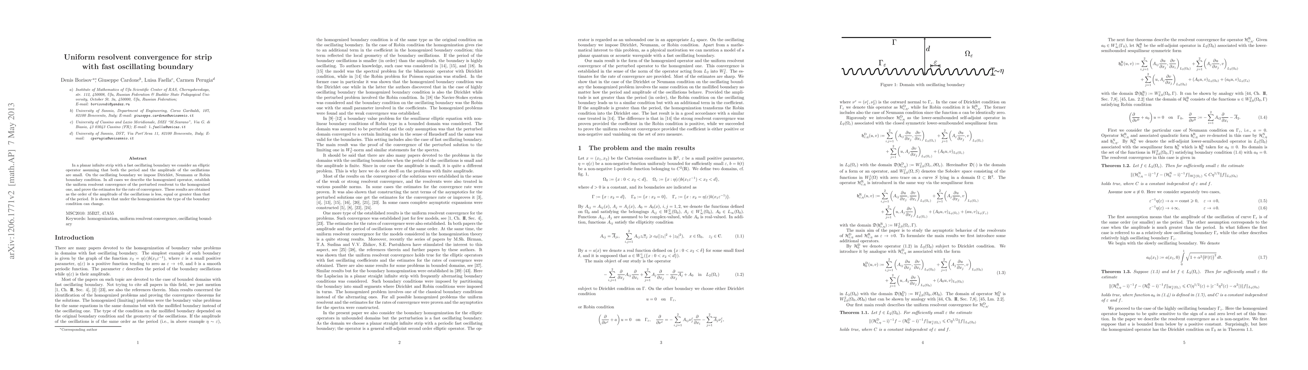 A research paper investigates uniform resolvent convergence of an elliptic operator in a planar strip with a fast oscillating boundary, finding homogenization and type change under boundary conditions.