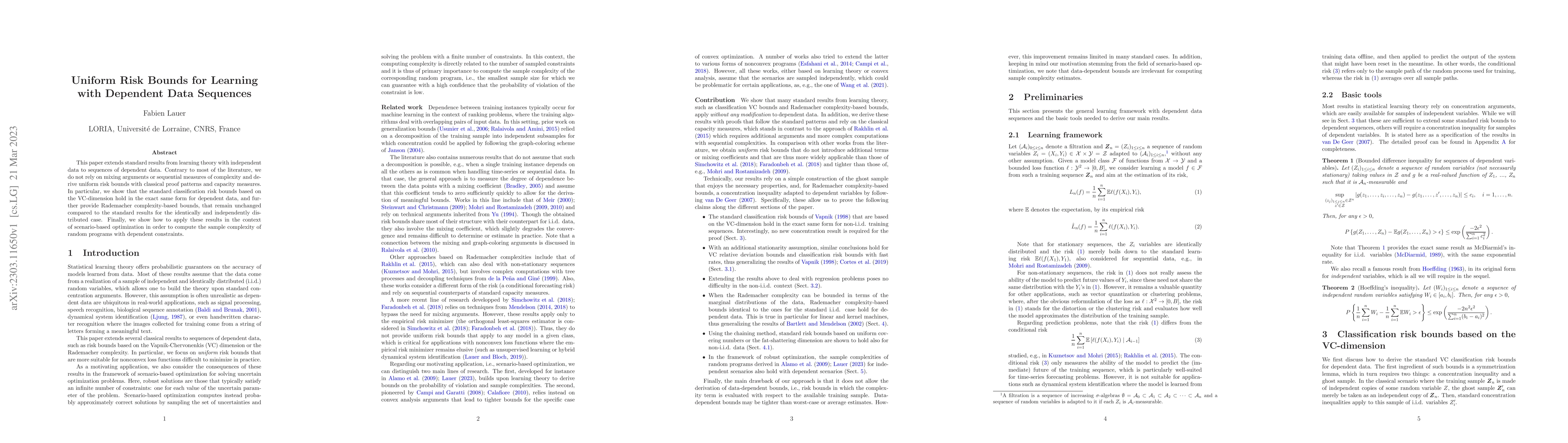 This paper extends learning theory to dependent data sequences, deriving uniform risk bounds without relying on mixing arguments, and shows that standard classification risk bounds based on VC-dimension remain valid. It also provides Rademacher complexity-based bounds and applies these results to scenario-based optimization for random programs with dependent constraints.