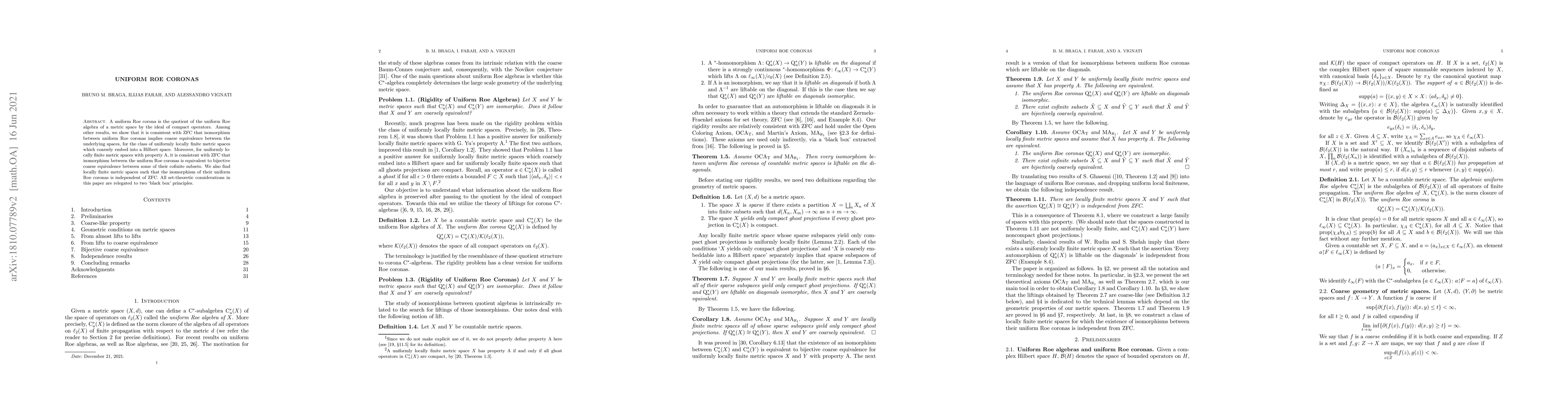 This paper investigates uniform Roe coronas, showing that isomorphism between them implies coarse equivalence for uniformly locally finite metric spaces coarsely embedding into a Hilbert space, within the framework of ZFC. It also examines cases where isomorphisms correspond to bijective coarse equivalences on cofinite subsets for spaces with property A, while highlighting instances where the isomorphism independence is left to set-theoretic principles.
