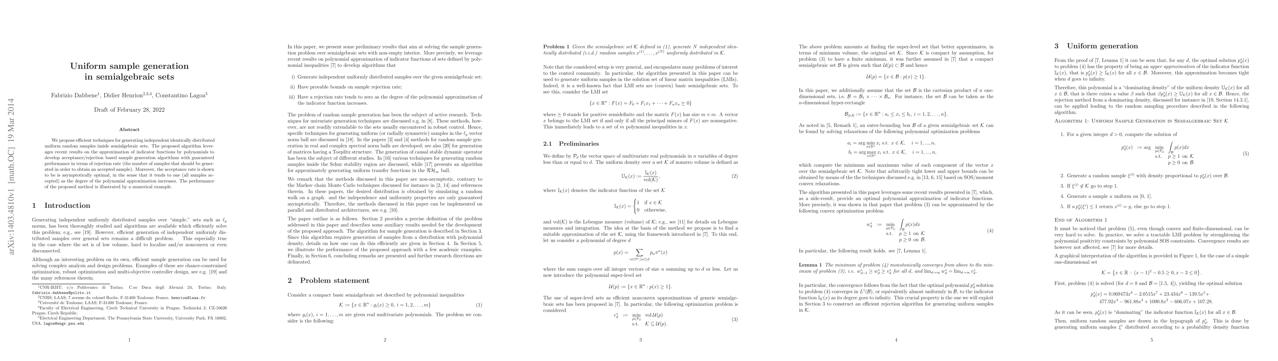 We propose efficient techniques for generating independent identically distributed uniform random samples inside semialgebraic sets. The proposed algorithm leverages recent results on the approximation of indicator functions by polynomials %\cite{DabHen:13} to develop acceptance/rejection based sample generation algorithms with guaranteed performance in terms of rejection rate (the number of samples that should be generated in order to obtain an accepted sample). Moreover, the {acceptance} rate is shown to be is asymptotically optimal, in the sense that it tends to one (all samples accepted) as the degree of the polynomial approximation increases. The performance of the proposed method is illustrated by a numerical example.