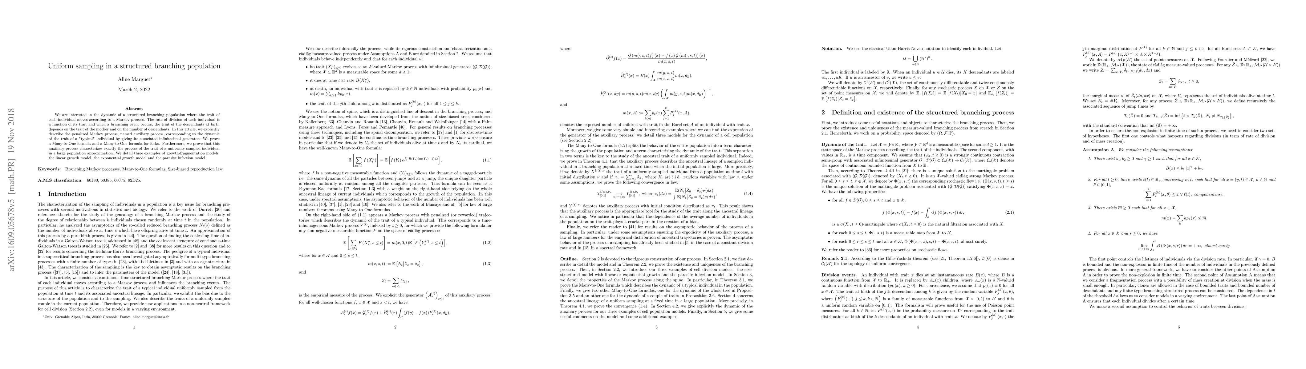 We are interested in the dynamic of a structured branching population where the trait of each individual moves according to a Markov process. The rate of division of each individual is a function of its trait and when a branching event occurs, the trait of the descendants at birth depends on the trait of the mother and on the number of descendants. In this article, we explicitly describe the penalized Markov process, named auxiliary process, corresponding to the dynamic of the trait along the spine by giving its associated infinitesimal generator. We prove a Many-to-One formula and a Many-to-One formula for forks. Furthermore, we prove that this auxiliary process characterizes exactly the process of the trait of a uniformly sampled individual in the large population approximation. We detail three examples of growth-fragmentation models: the linear growth model, the exponential growth model and the parasite infection model.