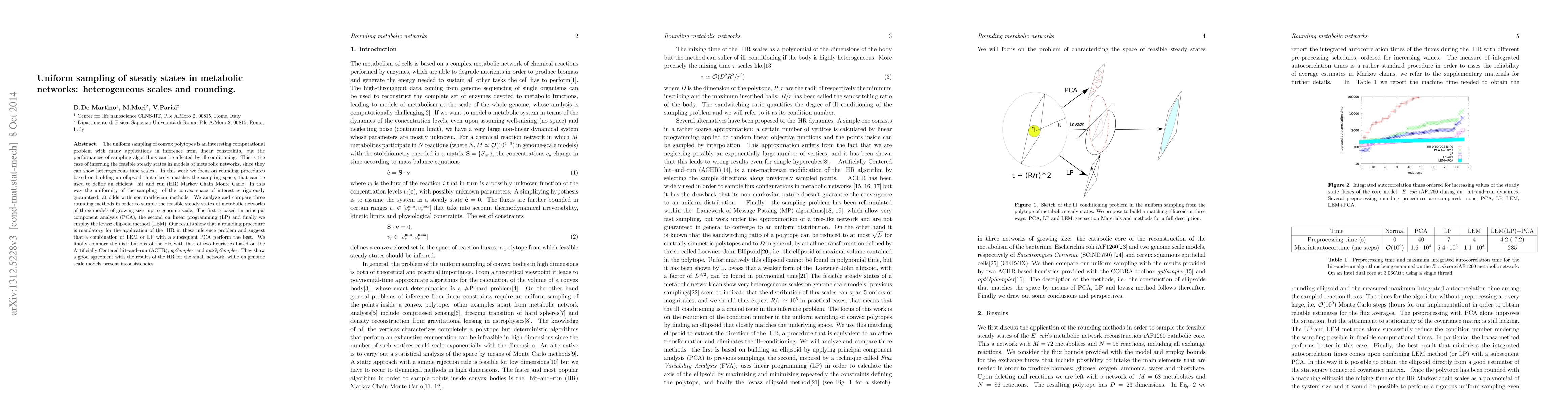 The uniform sampling of convex polytopes is an interesting computational problem with many applications in inference from linear constraints, but the performances of sampling algorithms can be affected by ill-conditioning. This is the case of inferring the feasible steady states in models of metabolic networks, since they can show heterogeneous time scales . In this work we focus on rounding procedures based on building an ellipsoid that closely matches the sampling space, that can be used to define an efficient hit-and-run (HR) Markov Chain Monte Carlo. In this way the uniformity of the sampling of the convex space of interest is rigorously guaranteed, at odds with non markovian methods. We analyze and compare three rounding methods in order to sample the feasible steady states of metabolic networks of three models of growing size up to genomic scale. The first is based on principal component analysis (PCA), the second on linear programming (LP) and finally we employ the lovasz ellipsoid method (LEM). Our results show that a rounding procedure is mandatory for the application of the HR in these inference problem and suggest that a combination of LEM or LP with a subsequent PCA perform the best. We finally compare the distributions of the HR with that of two heuristics based on the Artificially Centered hit-and-run (ACHR), gpSampler and optGpSampler. They show a good agreement with the results of the HR for the small network, while on genome scale models present inconsistencies.