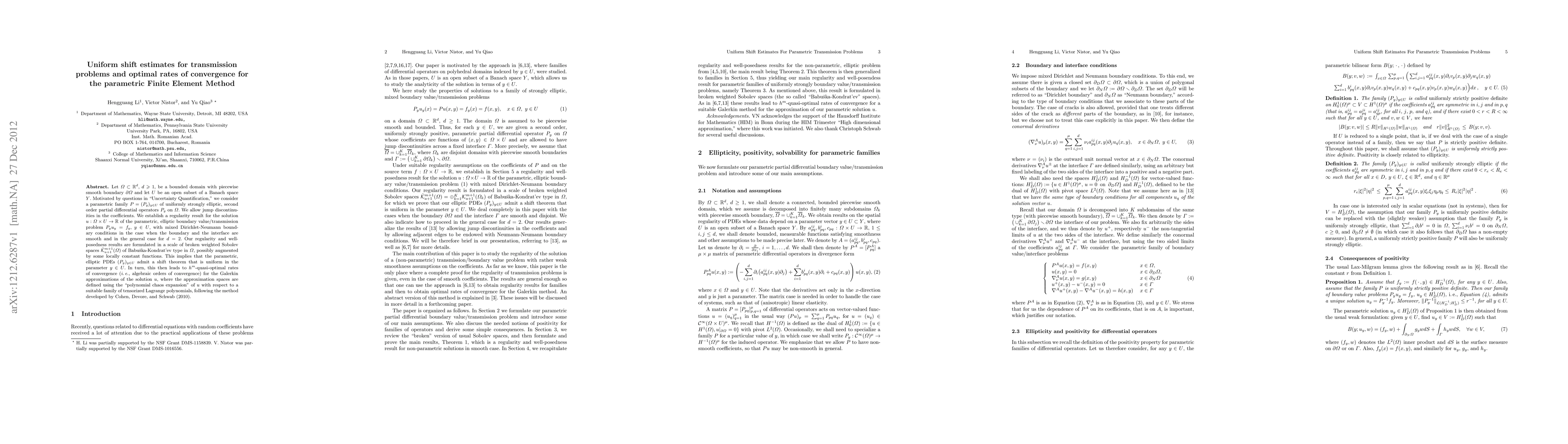 Let $\Omega \subset \RR^d$, $d \geqslant 1$, be a bounded domain with piecewise smooth boundary $\partial \Omega $ and let $U$ be an open subset of a Banach space $Y$. Motivated by questions in "Uncertainty Quantification," we consider a parametric family $P = (P_y)_{y \in U}$ of uniformly strongly elliptic, second order partial differential operators $P_y$ on $\Omega$. We allow jump discontinuities in the coefficients. We establish a regularity result for the solution $u: \Omega \times U \to \RR$ of the parametric, elliptic boundary value/transmission problem $P_y u_y = f_y$, $y \in U$, with mixed Dirichlet-Neumann boundary conditions in the case when the boundary and the interface are smooth and in the general case for $d=2$. Our regularity and well-posedness results are formulated in a scale of broken weighted Sobolev spaces $\hat\maK^{m+1}_{a+1}(\Omega)$ of Babu\v{s}ka-Kondrat'ev type in $\Omega$, possibly augmented by some locally constant functions. This implies that the parametric, elliptic PDEs $(P_y)_{y \in U}$ admit a shift theorem that is uniform in the parameter $y\in U$. In turn, this then leads to $h^m$-quasi-optimal rates of convergence (i.e. algebraic orders of convergence) for the Galerkin approximations of the solution $u$, where the approximation spaces are defined using the "polynomial chaos expansion" of $u$ with respect to a suitable family of tensorized Lagrange polynomials, following the method developed by Cohen, Devore, and Schwab (2010).