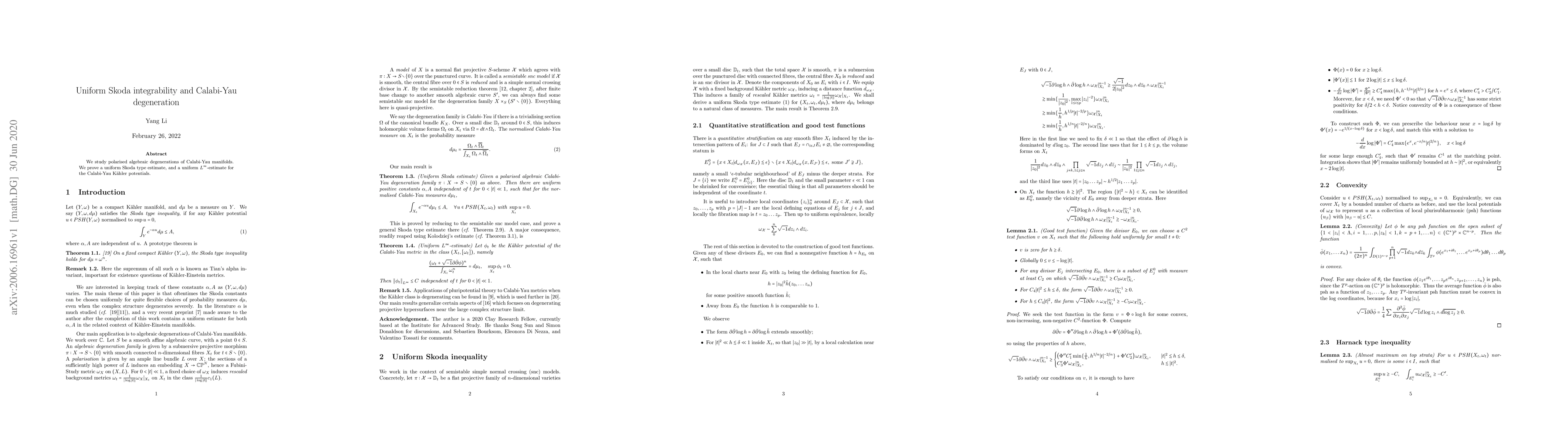 This paper investigates the algebraic degenerations of Calabi-Yau manifolds and establishes a uniform Skoda integrability estimate along with a uniform $L^\infty$-estimate for the Kähler potentials in these degenerations.