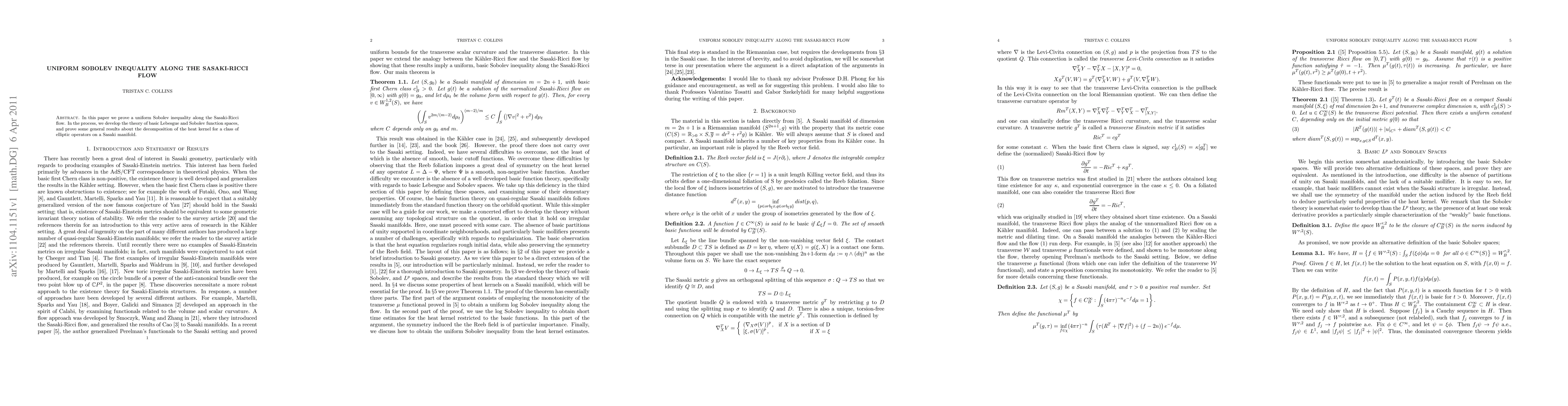 This paper establishes a uniform Sobolev inequality during the Sasaki-Ricci flow, developing foundational Lebesgue and Sobolev function spaces and deriving general results on the heat kernel decomposition for elliptic operators on Sasaki manifolds.
