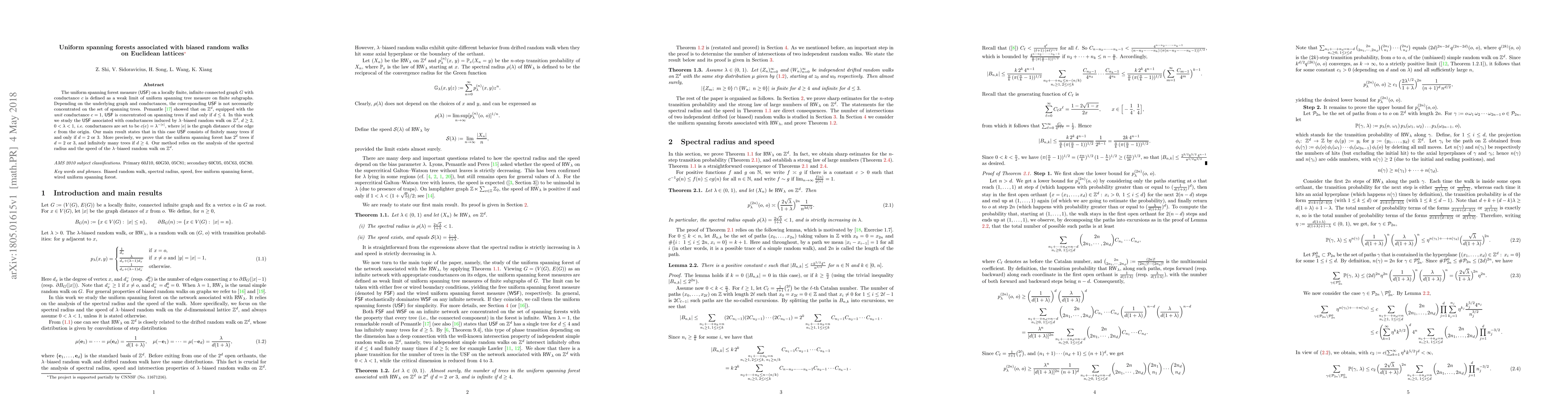 The uniform spanning forest measure ($\mathsf{USF}$) on a locally finite, infinite connected graph $G$ with conductance $c$ is defined as a weak limit of uniform spanning tree measure on finite subgraphs. Depending on the underlying graph and conductances, the corresponding $\mathsf{USF}$ is not necessarily concentrated on the set of spanning trees. Pemantle~\cite{PR1991} showed that on $\mathbb{Z}^d$, equipped with the unit conductance $ c=1$, $\mathsf{USF}$ is concentrated on spanning trees if and only if $d \leq 4$. In this work we study the $\mathsf{USF}$ associated with conductances induced by $\lambda$--biased random walk on $\mathbb{Z}^d$, $d \geq 2$, $0 < \lambda < 1$, i.e. conductances are set to be $c(e) = \lambda^{-|e|}$, where $|e|$ is the graph distance of the edge $e$ from the origin. Our main result states that in this case $\mathsf{USF}$ consists of finitely many trees if and only if $d = 2$ or $3$. More precisely, we prove that the uniform spanning forest has $2^d$ trees if $d = 2$ or $3$, and infinitely many trees if $d \geq 4$. Our method relies on the analysis of the spectral radius and the speed of the $\lambda$--biased random walk on $\mathbb{Z}^d$.