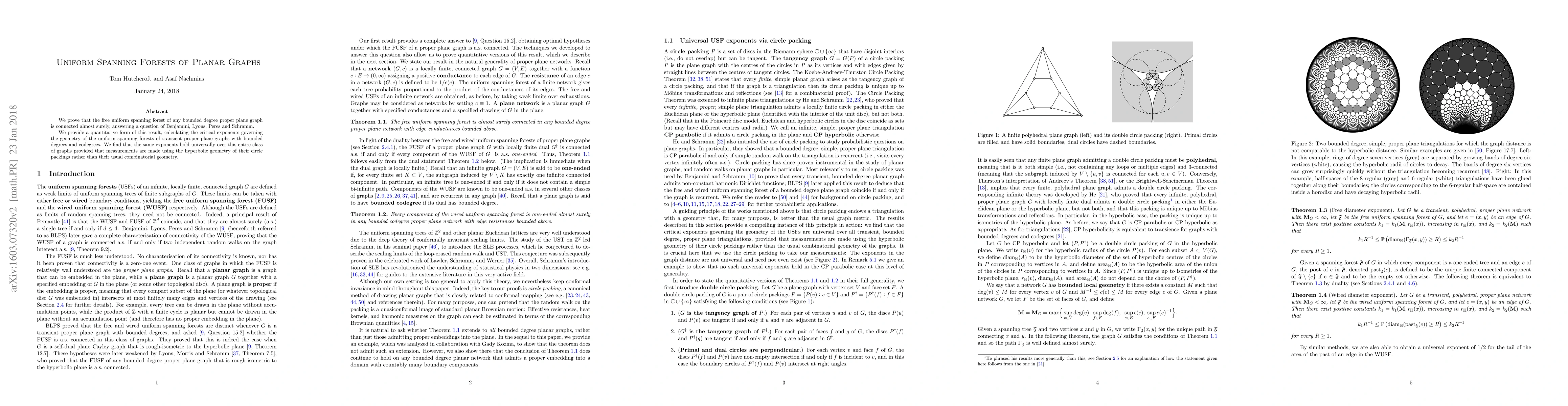 This paper proves that the uniform spanning forest of any bounded degree planar graph is almost surely connected, addressing a question posed by Benjamini, Lyons, Peres, and Schramm. It also quantifies this result by determining critical exponents governing the geometry of these forests, showing universal applicability across transient proper planar graphs using hyperbolic geometry.