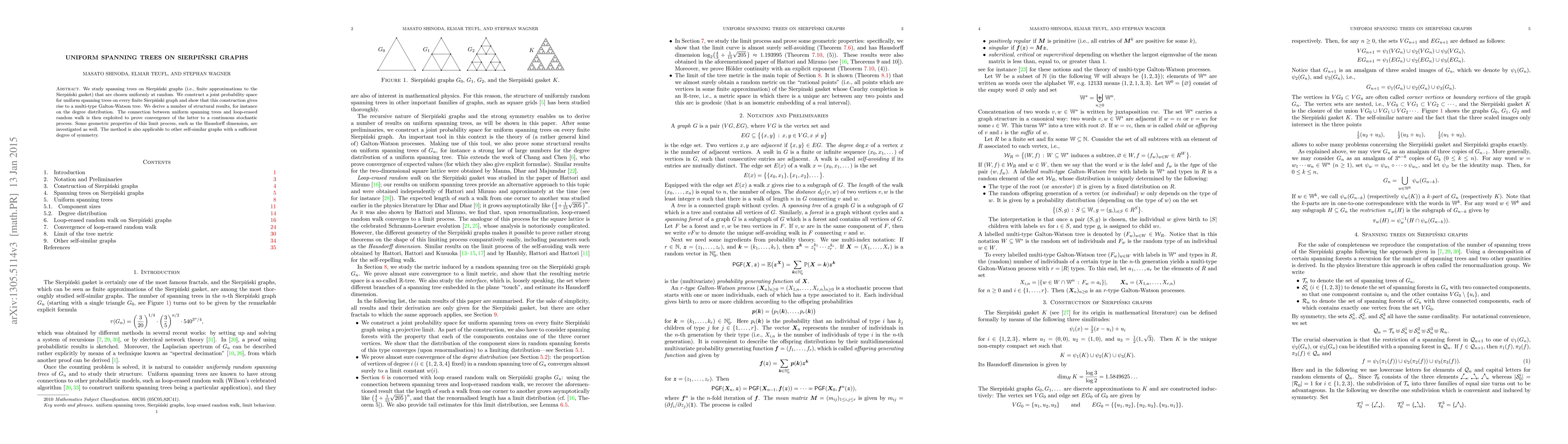 This paper investigates uniform spanning trees on Sierpinski graphs, constructing a joint probability space that leads to a multi-type Galton-Watson tree. It explores the convergence of loop-erased random walk to a continuous stochastic process, examining its geometric properties like Hausdorff dimension.