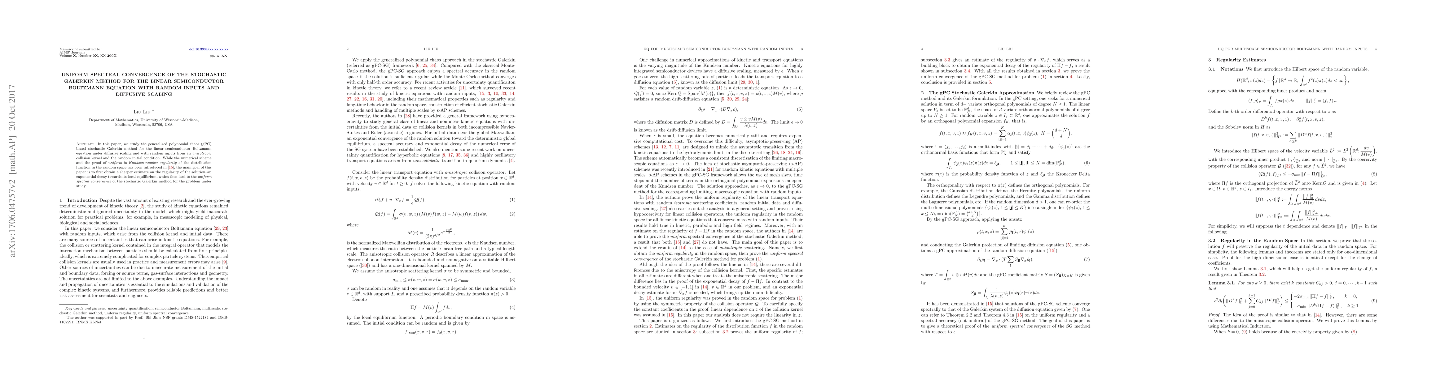 In this paper, we study the generalized polynomial chaos (gPC) based stochastic Galerkin method for the linear semiconductor Boltzmann equation under diffusive scaling and with random inputs from an anisotropic collision kernel and the random initial condition. While the numerical scheme and the proof of uniform-in-Knudsen-number regularity of the distribution function in the random space has been introduced in [Jin-Liu-16'], the main goal of this paper is to first obtain a sharper estimate on the regularity of the solution-an exponential decay towards its local equilibrium, which then lead to the uniform spectral convergence of the stochastic Galerkin method for the problem under study.