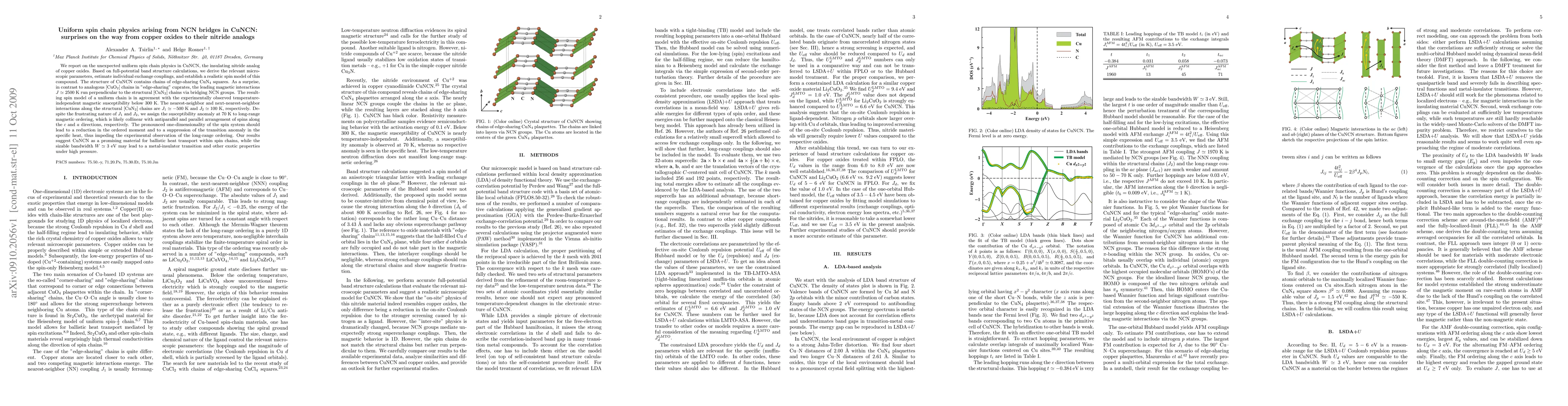 We report on the unexpected uniform spin chain physics in CuNCN, the insulating nitride analog of copper oxides. Based on full-potential band structure calculations, we derive the relevant microscopic parameters, estimate individual exchange couplings, and establish a realistic spin model of this compound. The structure of CuNCN contains chains of edge-sharing CuN(4) squares. As a surprise, in contrast to analogous [CuO(2)] chains in "edge-sharing" cuprates, the leading magnetic interactions J ~ 2500 K run perpendicular to the structural [CuN(2)] chains via bridging NCN groups. The resulting spin model of a uniform chain is in agreement with the experimentally observed temperature-independent magnetic susceptibility below 300 K. The nearest-neighbor and next-nearest-neighbor interactions along the structural [CuN(2)] chains are J(1) ~ -500 K and J(2) ~ 100 K, respectively. Despite the frustrating nature of J(1) and J(2), we assign the anomaly at 70 K to long-range magnetic ordering, which is likely collinear with antiparallel and parallel arrangement of spins along the 'c' and 'a' directions, respectively. The pronounced one-dimensionality of the spin system should lead to a reduction in the ordered moment and to a suppression of the transition anomaly in the specific heat, thus impeding the experimental observation of the long-range ordering. Our results suggest CuNCN as a promising material for ballistic heat transport within spin chains, while the sizable bandwidth W ~ 3 eV may lead to a metal-insulator transition and other exotic properties under high pressure.