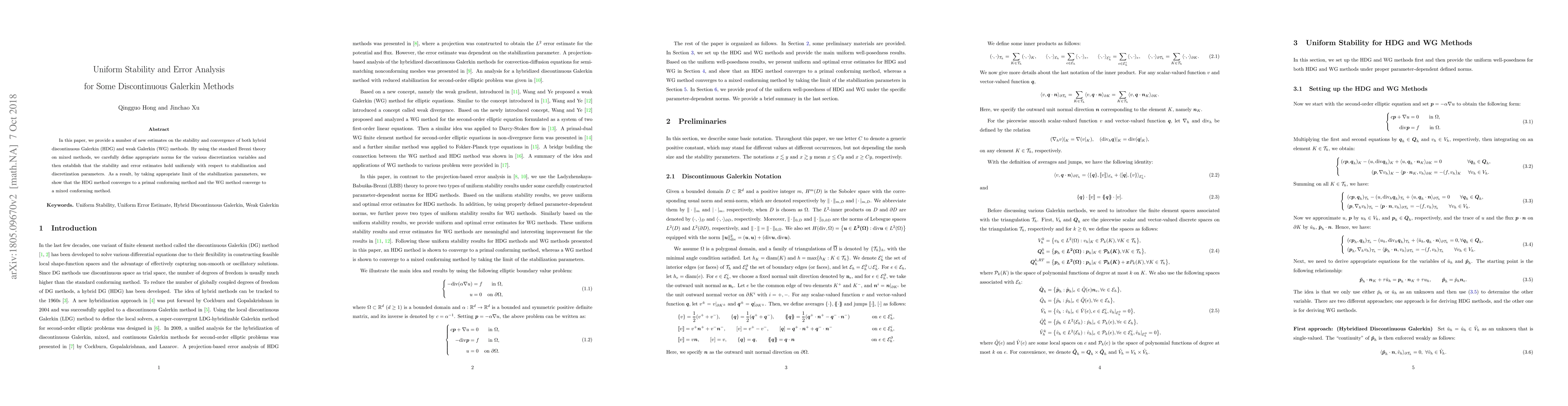 The paper provides new estimates on stability and convergence of hybrid discontinuous Galerkin and weak Galerkin methods, showing they converge to primal conforming and mixed conforming methods respectively.