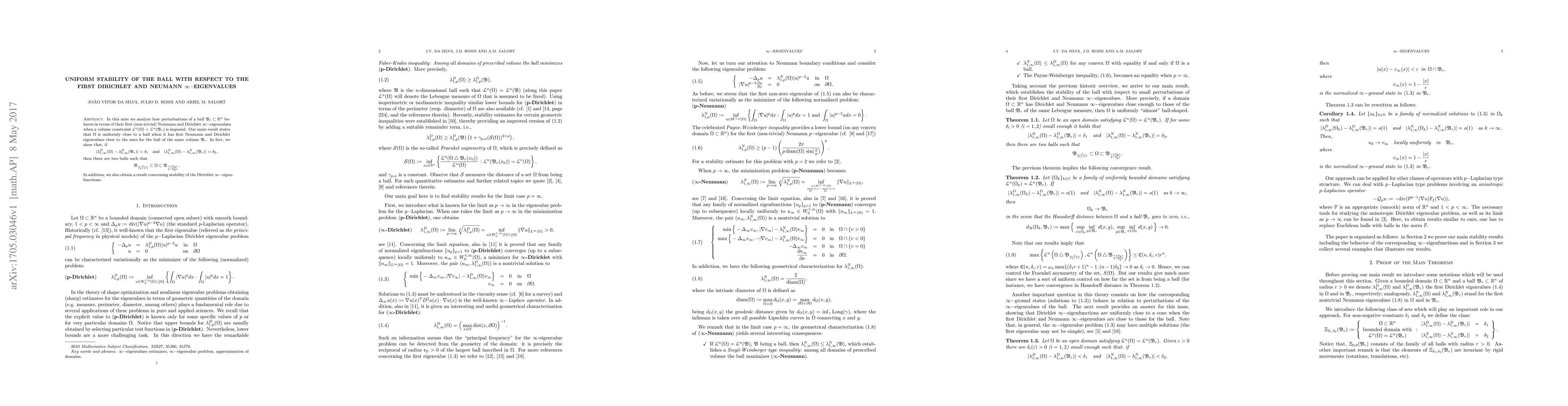 The paper investigates how perturbations of a ball behave in terms of their first Neumann and Dirichlet $\infty-$eigenvalues when subject to a volume constraint, showing that the perturbation is uniformly close to a ball if its eigenvalues are close to those of the original ball.