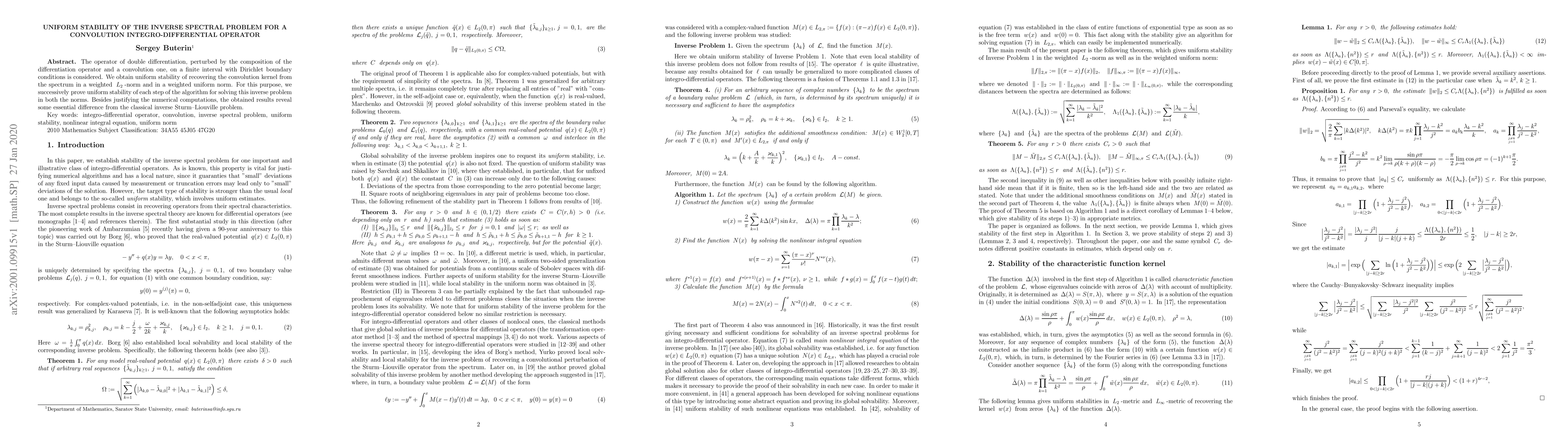 The operator of double differentiation, perturbed by the composition of the differentiation operator and a convolution one, on a finite interval with Dirichlet boundary conditions is considered. We obtain uniform stability of recovering the convolution kernel from the spectrum in a weighted $L_2$-norm and in a weighted uniform norm. For this purpose, we successively prove uniform stability of each step of the algorithm for solving this inverse problem in both the norms. Besides justifying the numerical computations, the obtained results reveal some essential difference from the classical inverse Sturm-Liouville problem.