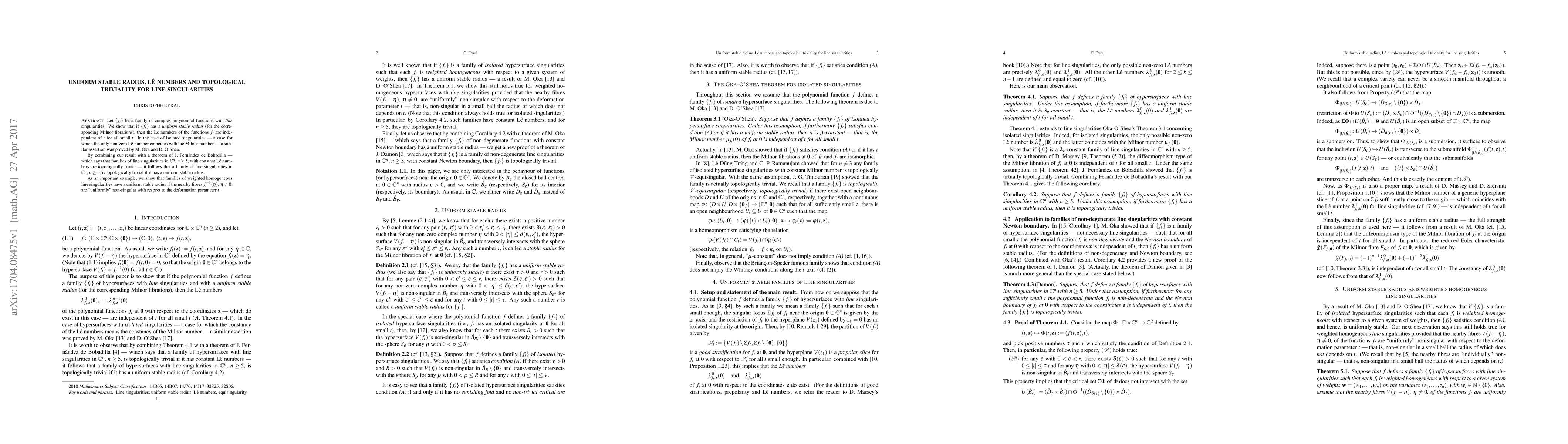 This paper demonstrates that if a family of complex polynomial functions with line singularities has a uniform stable radius, then their L^e numbers remain constant for small deformations. It further shows that such families with constant L^e numbers are topologically trivial in dimensions $n \geq 5$, thereby proving topological triviality for families with uniform stable radii.