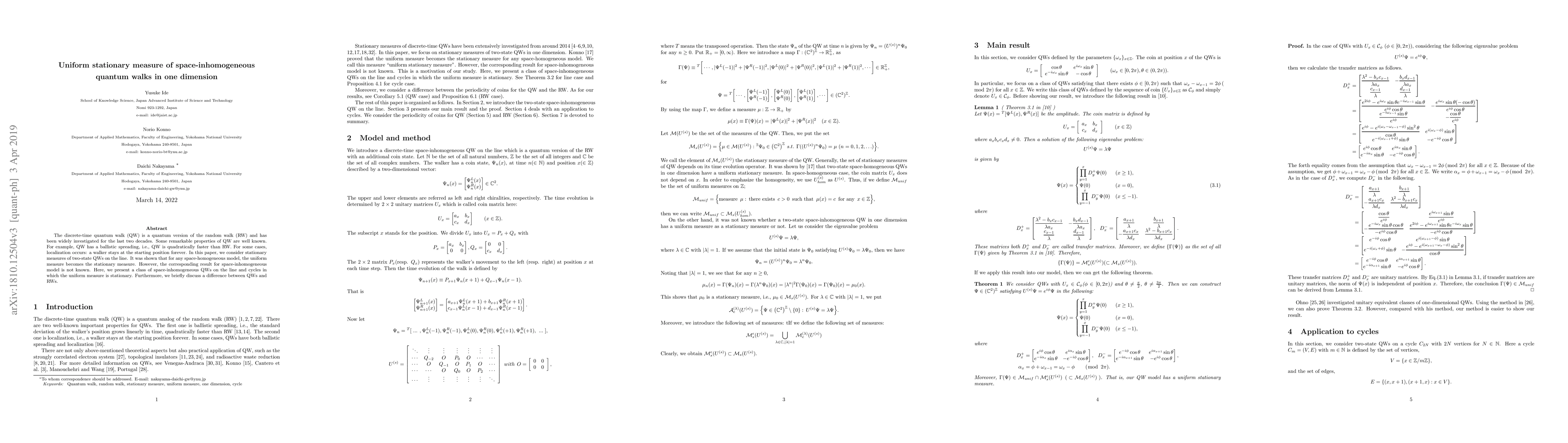 The discrete-time quantum walk (QW) is a quantum version of the random walk (RW) and has been widely investigated for the last two decades. Some remarkable properties of QW are well known. For example, QW has a ballistic spreading, i.e., QW is quadratically faster than RW. For some cases, localization occurs: a walker stays at the starting position forever. In this paper, we consider stationary measures of two-state QWs on the line. It was shown that for any space-homogeneous model, the uniform measure becomes the stationary measure. However, the corresponding result for space-inhomogeneous model is not known. Here, we present a class of space-inhomogeneous QWs on the line and cycles in which the uniform measure is stationary. Furthermore, we briefly discuss a difference between QWs and RWs.
