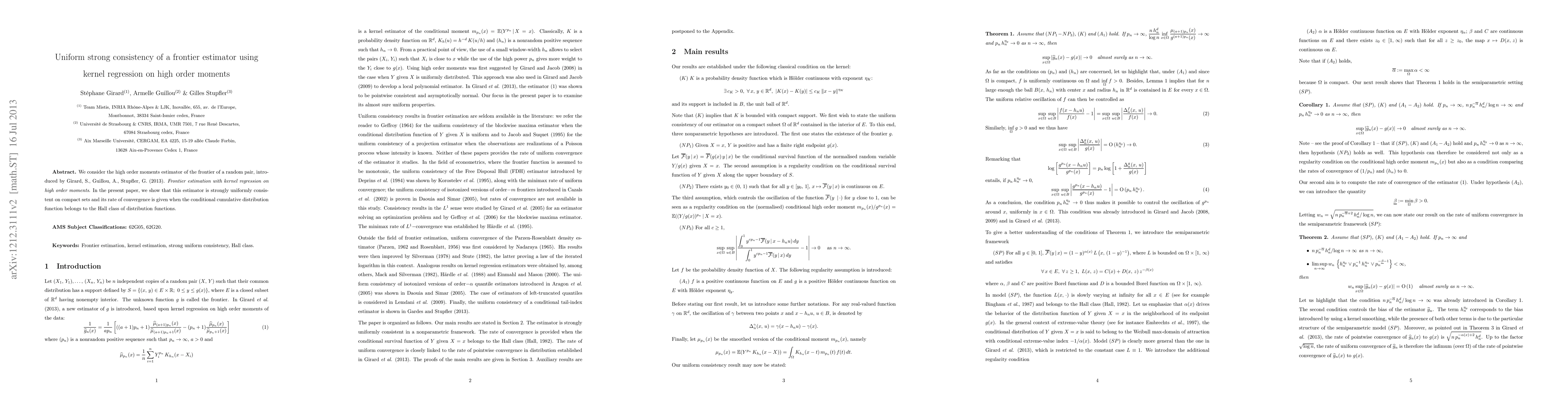 This paper demonstrates the strong uniform consistency of a frontier estimator based on kernel regression applied to high order moments, showing its convergence rate under specific distribution function conditions. The results extend previous work by Girard, Guillou, and Stupfler on frontier estimation using kernel methods.