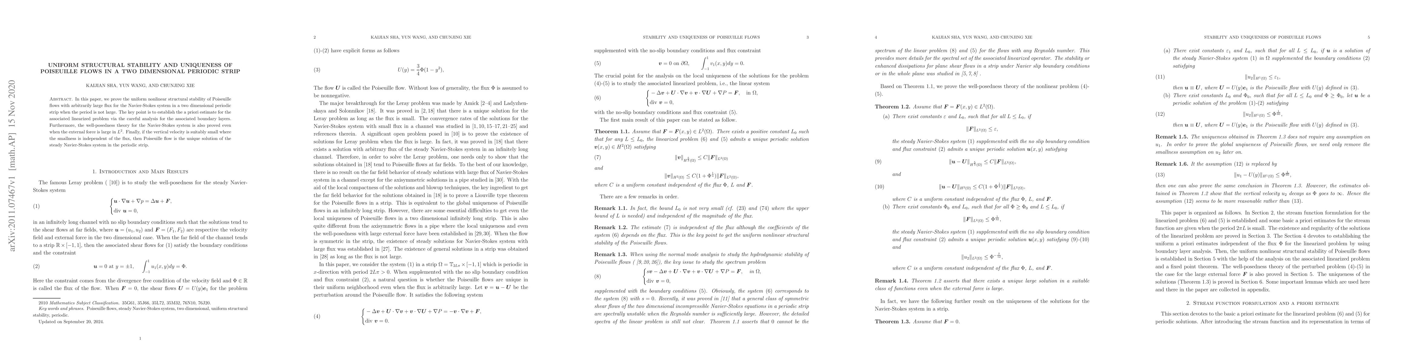 This paper proves the uniform structural stability and uniqueness of Poiseuille flows in a two-dimensional periodic strip for the Navier-Stokes system, even with large flux. It establishes a priori estimates for the linearized problem through boundary layer analysis and proves the well-posedness of the system under large external forces.