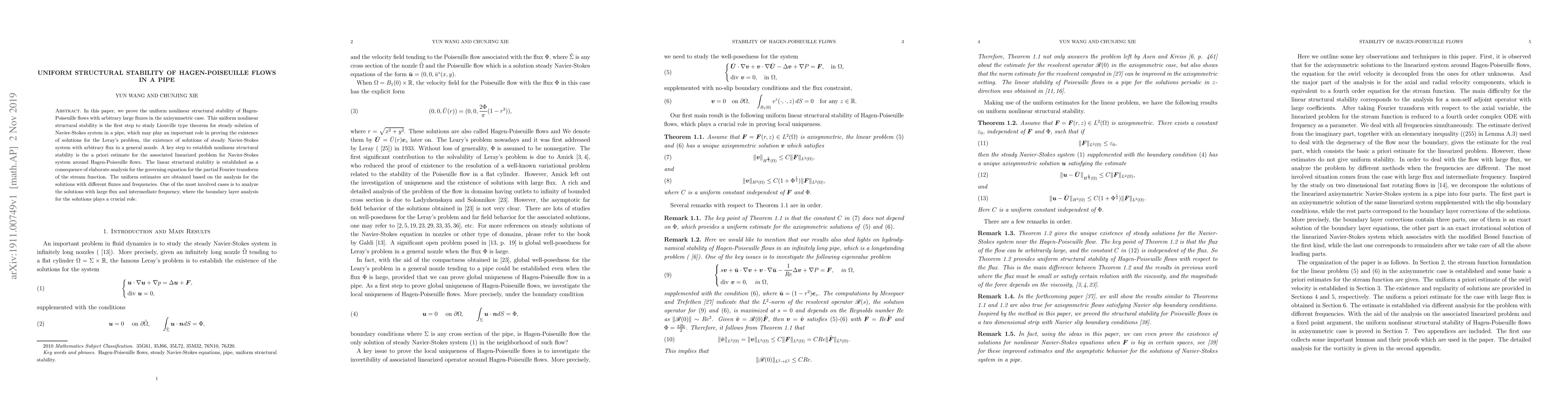 In this paper, we prove the uniform nonlinear structural stability of Hagen-Poiseuille flows with arbitrary large fluxes in the axisymmetric case. This uniform nonlinear structural stability is the first step to study Liouville type theorem for steady solution of Navier-Stokes system in a pipe, which may play an important role in proving the existence of solutions for the Leray's problem, the existence of solutions of steady Navier-Stokes system with arbitrary flux in a general nozzle. A key step to establish nonlinear structural stability is the a priori estimate for the associated linearized problem for Navier-Stokes system around Hagen-Poiseuille flows. The linear structural stability is established as a consequence of elaborate analysis for the governing equation for the partial Fourier transform of the stream function. The uniform estimates are obtained based on the analysis for the solutions with different fluxes and frequencies. One of the most involved cases is to analyze the solutions with large flux and intermediate frequency, where the boundary layer analysis for the solutions plays a crucial role.