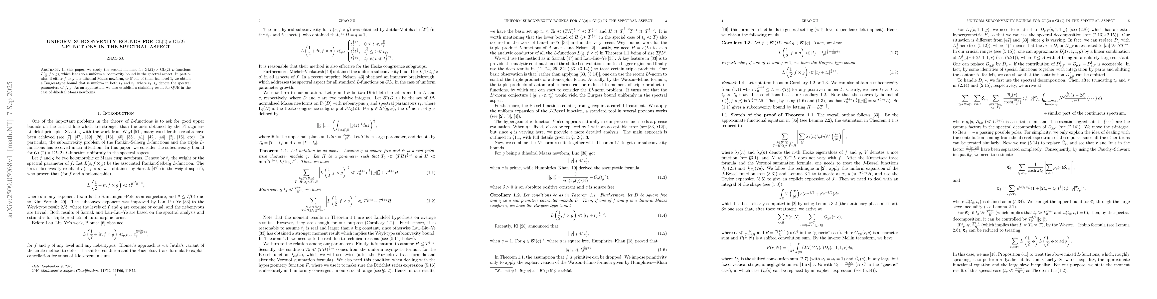 In this paper, we study the second moment for $GL(2)\times GL(2)$ $L$-functions $L(\frac{1}{2},f\times g)$, which leads to a uniform subconvexity bound in the spectral aspect. In particular, if either $f$ or $g$ is a dihedral Maass newform, or if one of them has level $1$, we obtain a Burgess-type bound that is uniform in both $t_f$ and $t_g$, where $t_f$, $t_g$ denote the spectral parameters of $f$, $g$. As an application, we also establish a shrinking result for QUE in the case of dihedral Maass newforms.