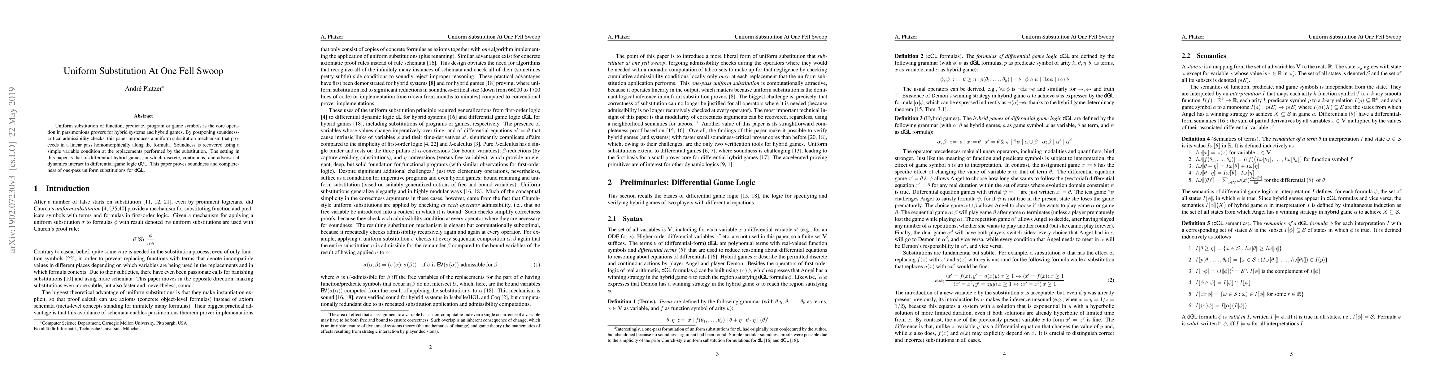 This paper introduces a uniform substitution mechanism for differential hybrid games, allowing linear pass homomorphic substitutions while postponing admissibility checks. Soundness is restored through a variable condition during substitution, proving the soundness and completeness of one-pass uniform substitutions in differential game logic (dGL).