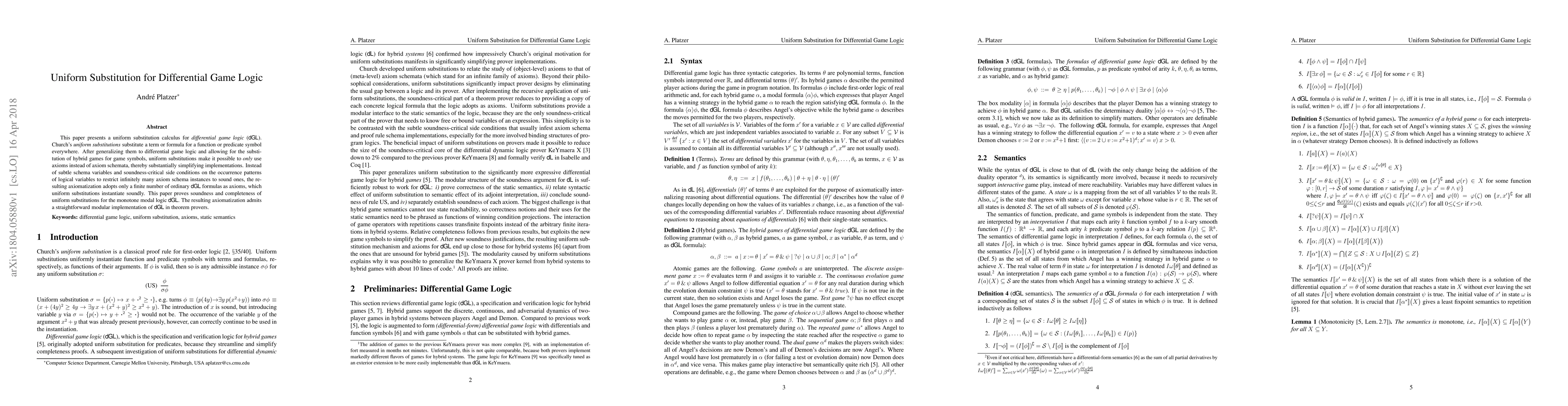 This paper introduces a uniform substitution calculus for differential game logic (dGL), simplifying its implementation by replacing axiom schemata with a finite set of axioms. It proves the soundness and completeness of these substitutions, enabling a straightforward modular implementation in theorem provers.