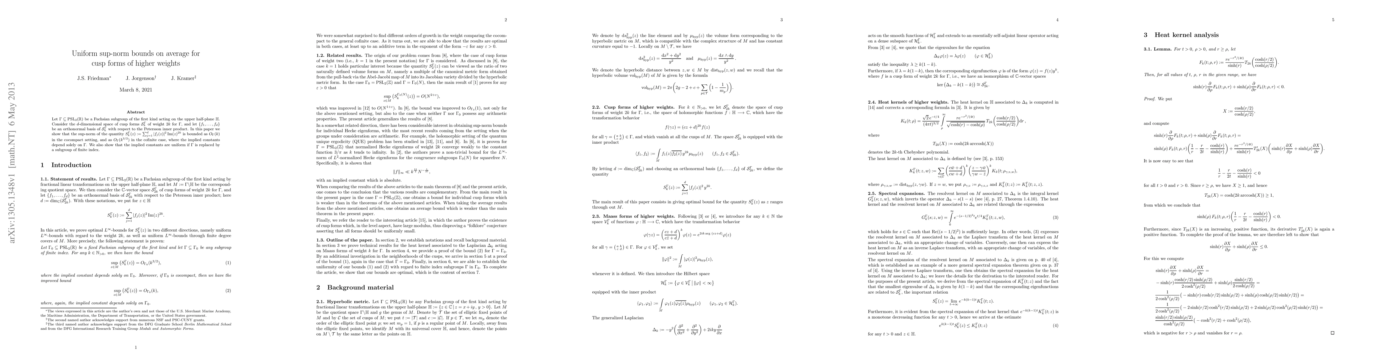 This paper provides uniform sup-norm bounds for the average of cusp forms of higher weights on Fuchsian subgroups of PSL₂(R). It establishes that the sup-norm of a specific weighted average of cusp forms is bounded by Oₖ(k) in cocompact cases and Oₖ(k³/₂) in cofinite cases, with uniform constants for subgroups of finite index.