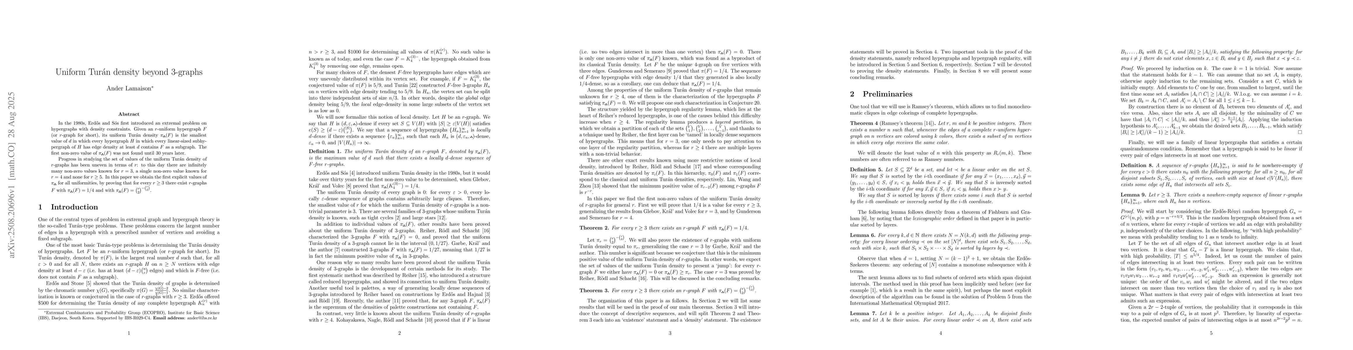 In the 1980s, Erd\H{o}s and S\'os first introduced an extremal problem on hypergraphs with density constraints. Given an $r$-uniform hypergraph $F$ (or $r$-graph for short), its uniform Tur\'an density $\pi_u(F)$ is the smallest value of $d$ in which every hypergraph $H$ in which every linear-sized subhypergraph of $H$ has edge density at least $d$ contains $F$ as a subgraph. The first non-zero value of $\pi_u(F)$ was not found until 30 years later. Progress in studying the set of values of the uniform Tur\'an density of $r$-graphs has been uneven in terms of $r$: to this day there are infinitely many non-zero values known for $r=3$, a single non-zero value known for $r=4$ and none for $r\geq 5$. In this paper we obtain the first explicit values of $\pi_u$ for all uniformities, by proving that for every $r\geq 3$ there exist $r$-graphs $F$ with $\pi_u(F)=1/4$ and with $\pi_u(F)=\binom{r}{2}^{-\binom{r}{2}}$.