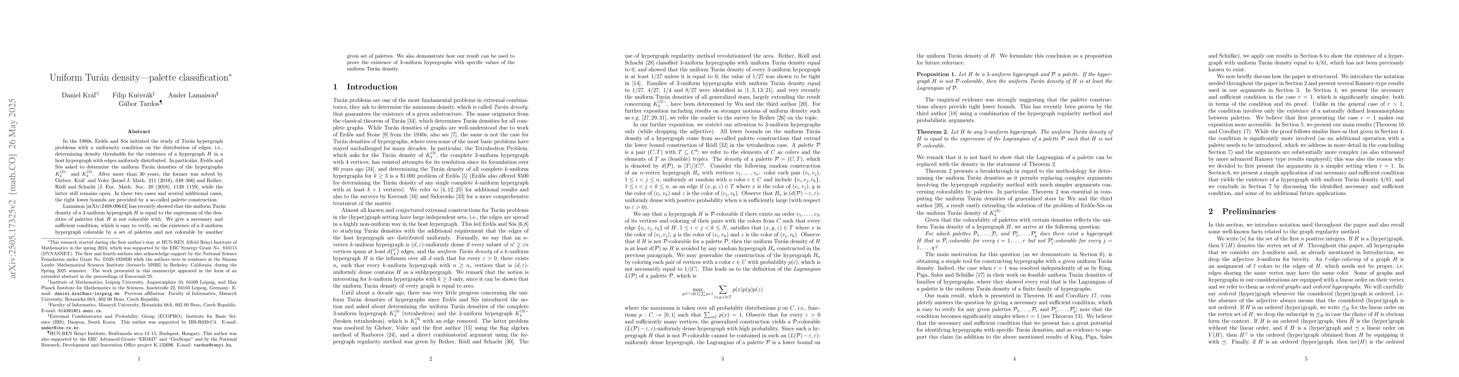 The paper builds upon the work of Erdős and Sós, focusing on uniform Turán densities of hypergraphs with a uniformity condition on edge distribution. It introduces a necessary and sufficient condition for the existence of a 3-uniform hypergraph colorable by certain palettes but not others.