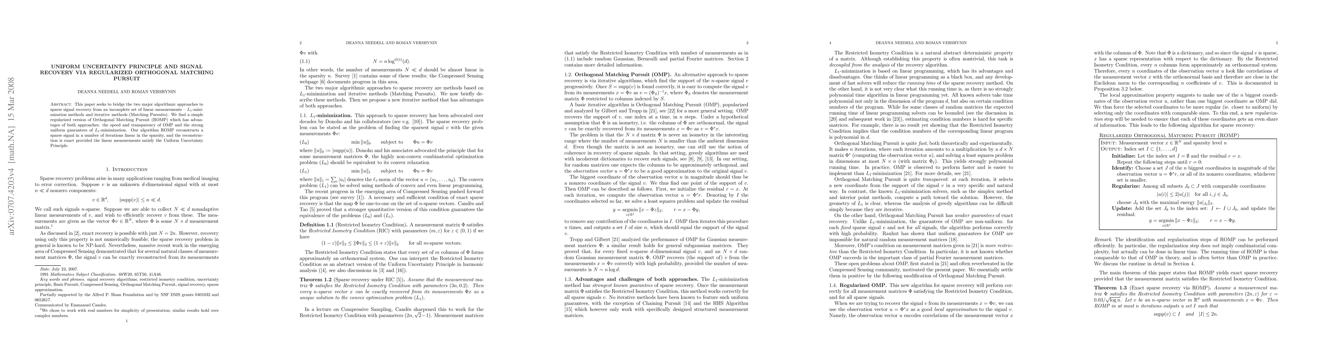 This paper introduces a regularized Orthogonal Matching Pursuit (ROMP) that combines the speed and simplicity of OMP with the strong uniform recovery guarantees of L_1-minimization, achieving exact sparse signal reconstruction under the Uniform Uncertainty Principle. The ROMP algorithm requires a number of iterations linear in sparsity, often logarithmic in practice.