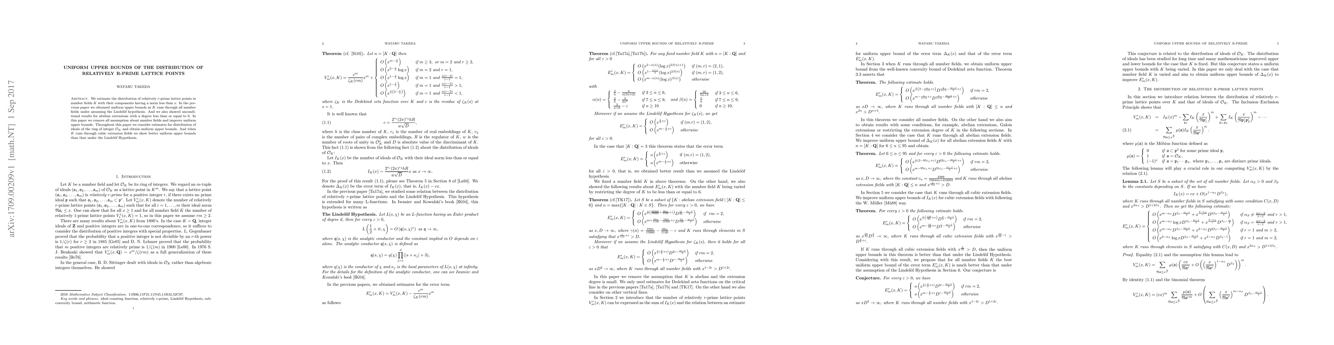 This paper removes assumptions about number fields to improve uniform upper bounds for the distribution of relatively $r$-prime lattice points in number fields $K$ with norm less than $x$. It also provides better bounds for cubic extensions compared to previous results under the Lindel\"of hypothesis.
