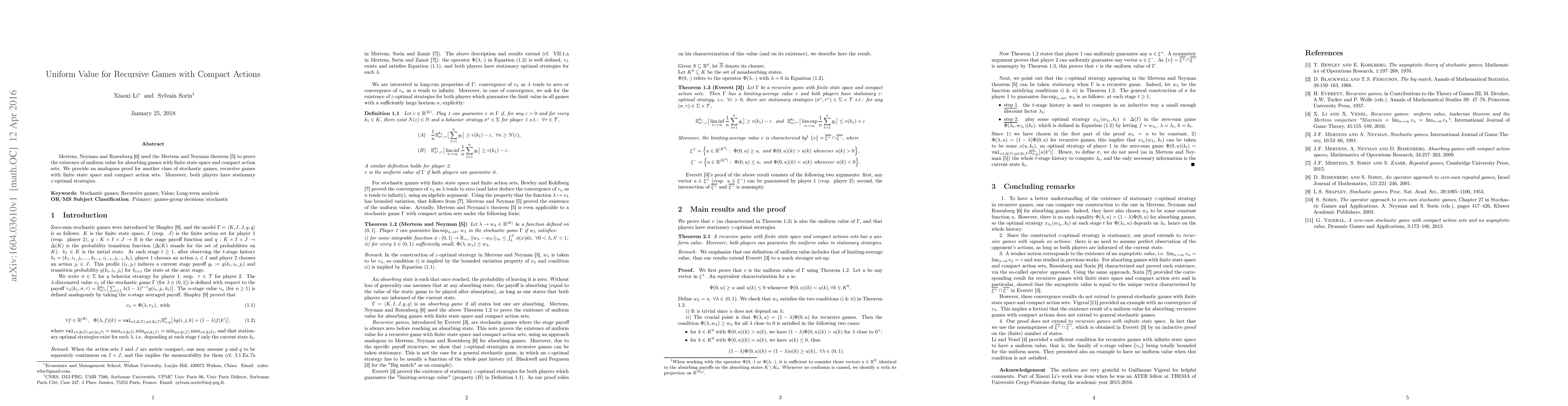 This paper extends the existence of a uniform value to recursive games with finite state space and compact action sets, analogous to the proof for absorbing games, and demonstrates that both players possess stationary epsilon-optimal strategies.