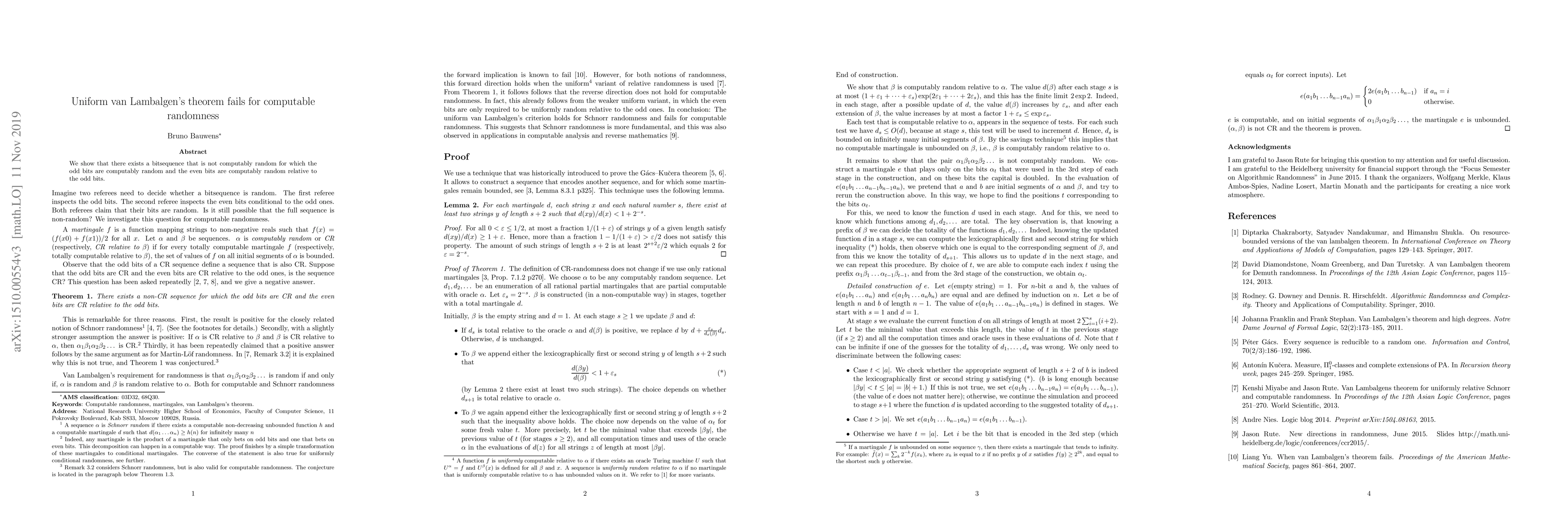 This paper demonstrates a bitsequence that is not computably random overall, yet its odd and even bits are computably random relative to the odd bits, invalidating the uniform version of van Lambalgen's theorem for computable randomness. The non-uniform variant's failure is already known.