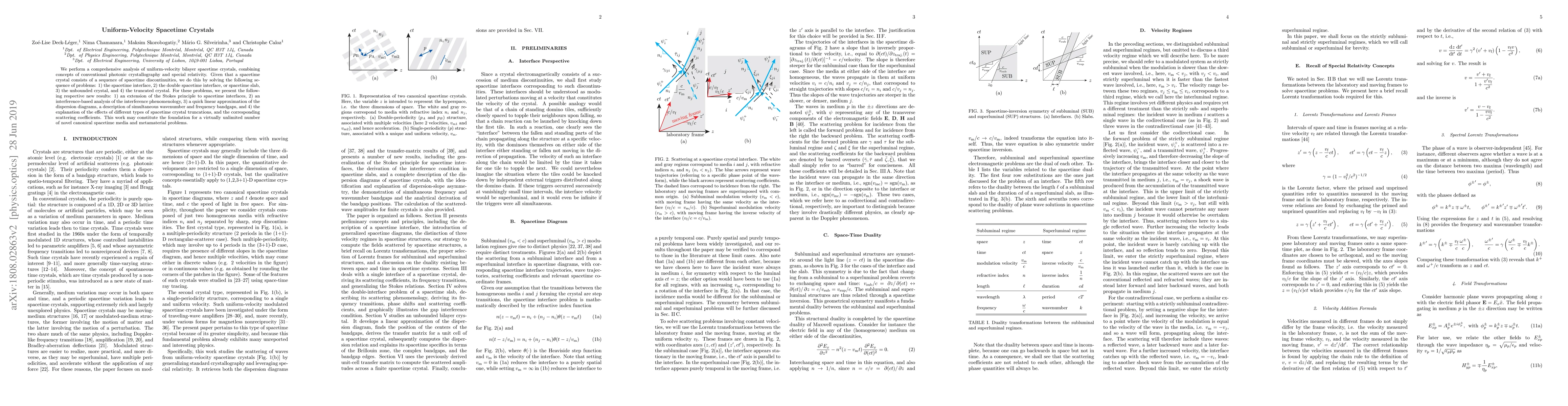 We perform a comprehensive analysis of uniform-velocity bilayer spacetime crystals, combining concepts of conventional photonic crystallography and special relativity. Given that a spacetime crystal consists of a sequence of spacetime discontinuities, we do this by solving the following sequence of problems: 1) the spacetime interface, 2) the double spacetime interface, or spacetime slab, 3) the unbounded crystal, and 4) the truncated crystal. For these problems, we present the following respective new results: 1) an extension of the Stokes principle to spacetime interfaces, 2) an interference-based analysis of the interference phenomenology, 3) a quick linear approximation of the dispersion diagrams, a description of simultaneous wavenumber and frequency bandgaps, and 4) the explanation of the effects of different types of spacetime crystal truncations, and the corresponding scattering coefficients. This work may constitute the foundation for a virtually unlimited number of novel canonical spacetime media and metamaterial problems.