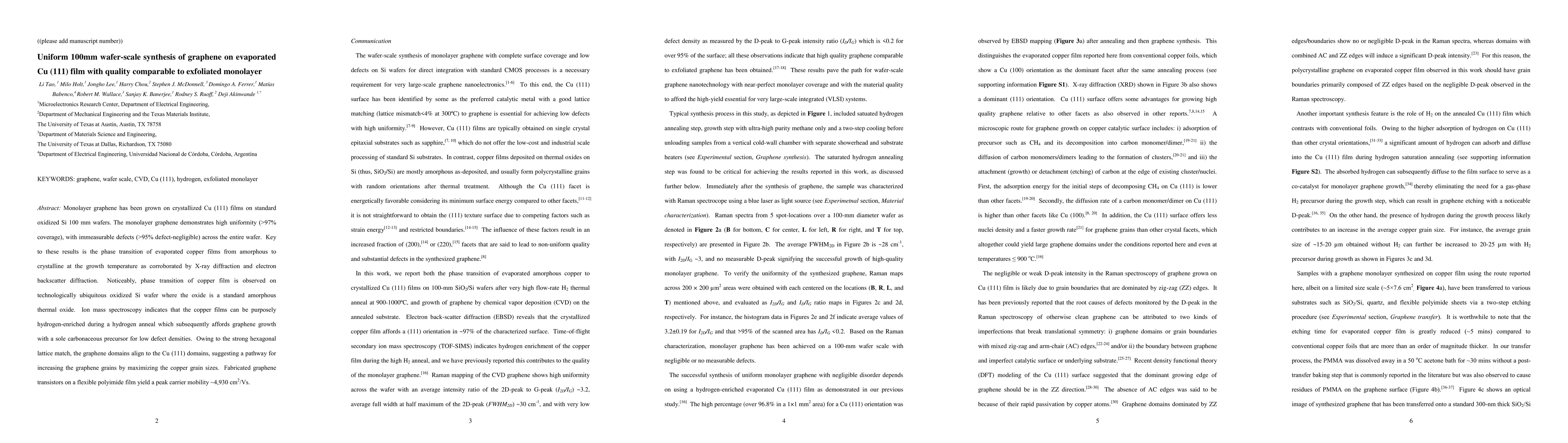 This study reports the uniform wafer-scale synthesis of high-quality monolayer graphene on evaporated Cu (111) films, achieving >97% coverage and >95% defect-negligible uniformity. The process hinges on the phase transition of copper films and hydrogen-enrichment during annealing, resulting in graphene with comparable quality to exfoliated monolayers.