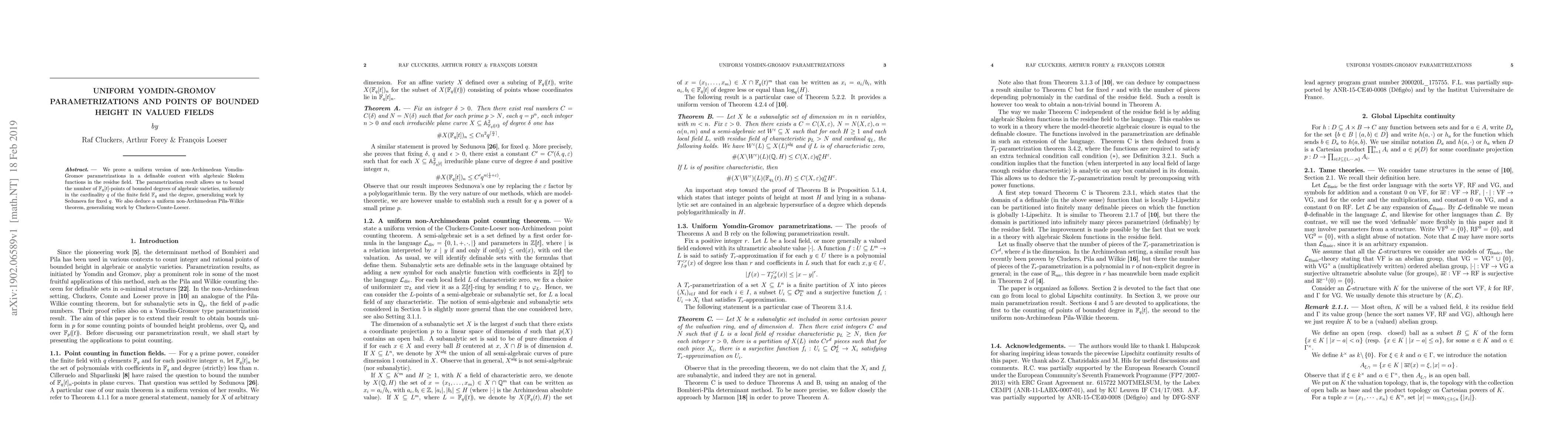 We prove a uniform version of non-Archimedean Yomdin-Gromov parametrizations in a definable context with algebraic Skolem functions in the residue field. The parametrization result allows us to bound the number of F_q[t]-points of bounded degrees of algebraic varieties, uniformly in the cardinality q of the finite field F_q and the degree, generalizing work by Sedunova for fixed q. We also deduce a uniform non-Archimedean Pila-Wilkie theorem, generalizing work by Cluckers-Comte-Loeser.