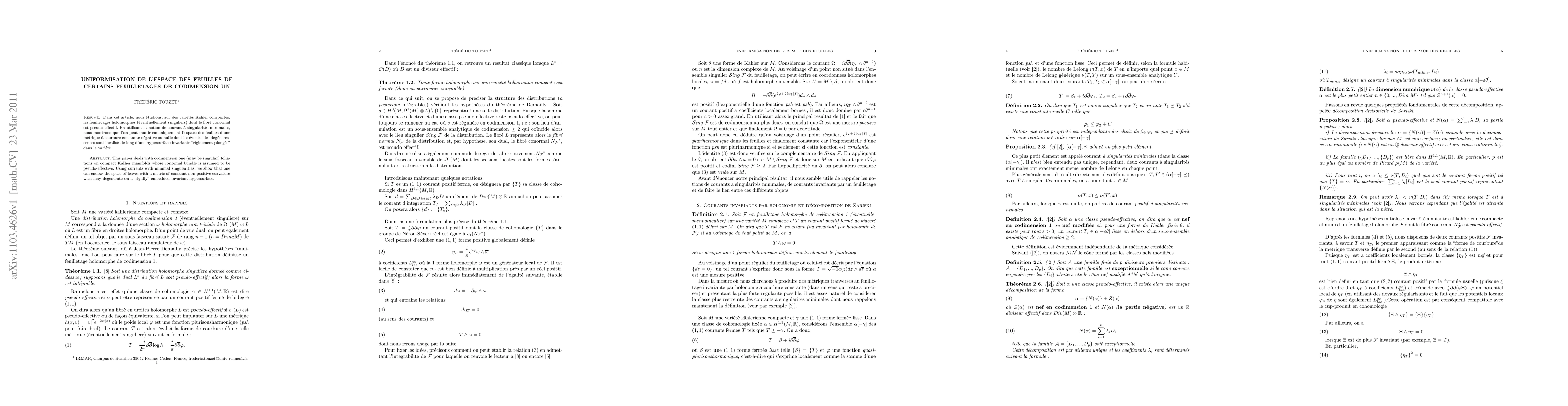 This paper deals with codimension one (may be singular) foliations on compact K\"alher manifolds whose conormal bundle is assumed to be pseudo-effective. Using currents with minimal singularities, we show that one can endow the space of leaves with a metric of constant non positive curvature wich may degenerate on a rigidly embedded invariant hypersurface.