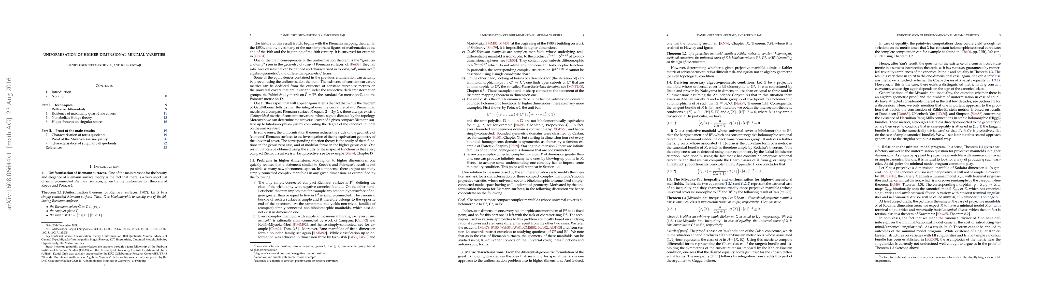 The research employs uniformization techniques for higher-dimensional minimal varieties, building upon classical results for Riemann surfaces and projective manifolds with trivial or ample canonical bundles. It introduces technical concepts and outlines proofs for recent uniformization theorems for singular varieties, developed in collaboration with Thomas Peternell.